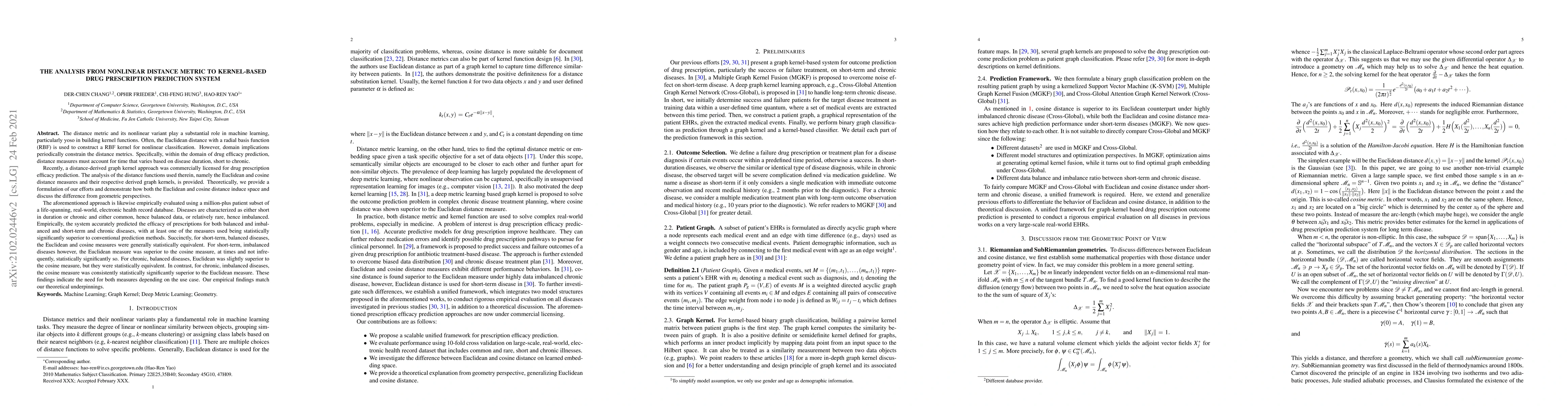 This paper analyzes the application of nonlinear distance metrics in predicting drug prescription outcomes, demonstrating that Euclidean distance is effective for short-term diseases while cosine distance is better for chronic diseases. The study establishes geometric properties of these metrics and validates their effectiveness through large-scale electronic health records and visualization.