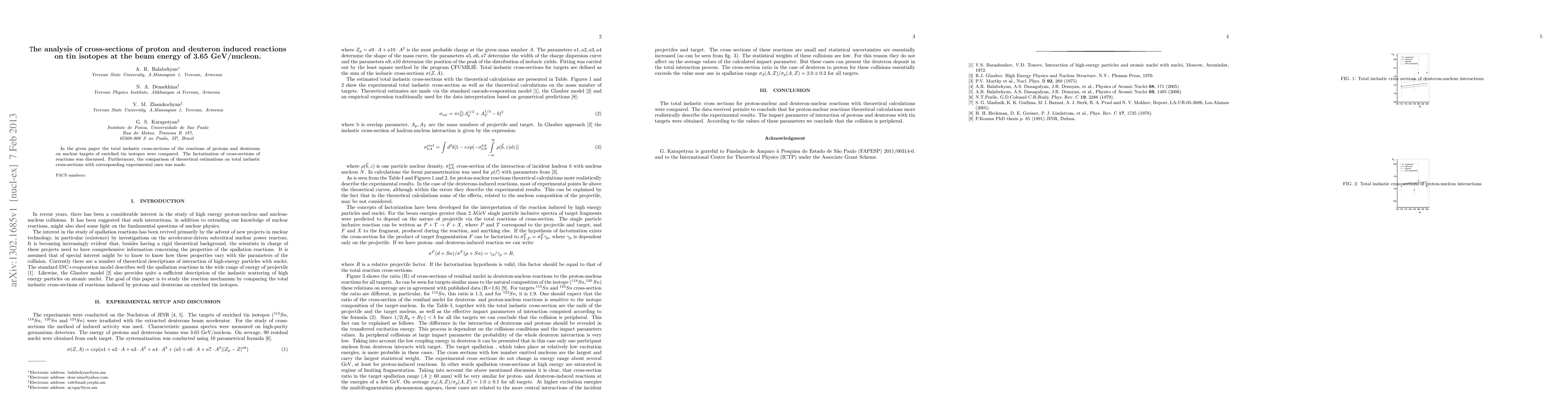 This paper analyzes the total inelastic cross-sections for proton and deuteron reactions on enriched tin isotopes at 3.65 GeV/nucleon, discussing reaction factorization and comparing theoretical estimates with experimental data.