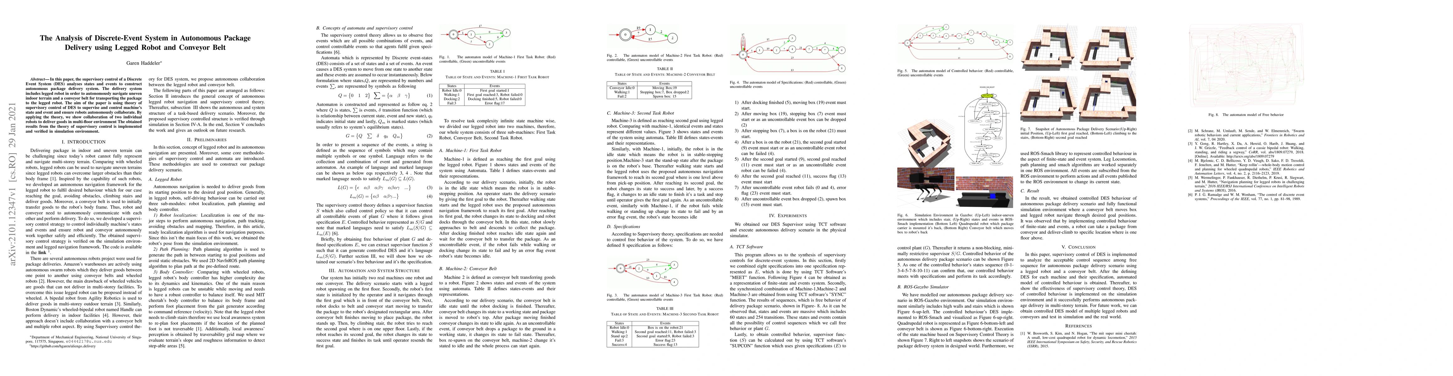 In this paper, the supervisory control of a Discrete Event System (DES) analyses states and events to construct an autonomous package delivery system. The delivery system includes a legged robot in order to autonomously navigate uneven indoor terrain and a conveyor belt for transporting the package to the legged robot.The aim of the paper is using the theory of supervisory control of DES to supervise and control machine's state and event and ensure robots autonomously collaborate. By applying the theory, we show the collaboration of two individual robots to deliver goods in a multi-floor environment. The obtained results from the theory of supervisory control are implemented and verified in a simulation environment.
