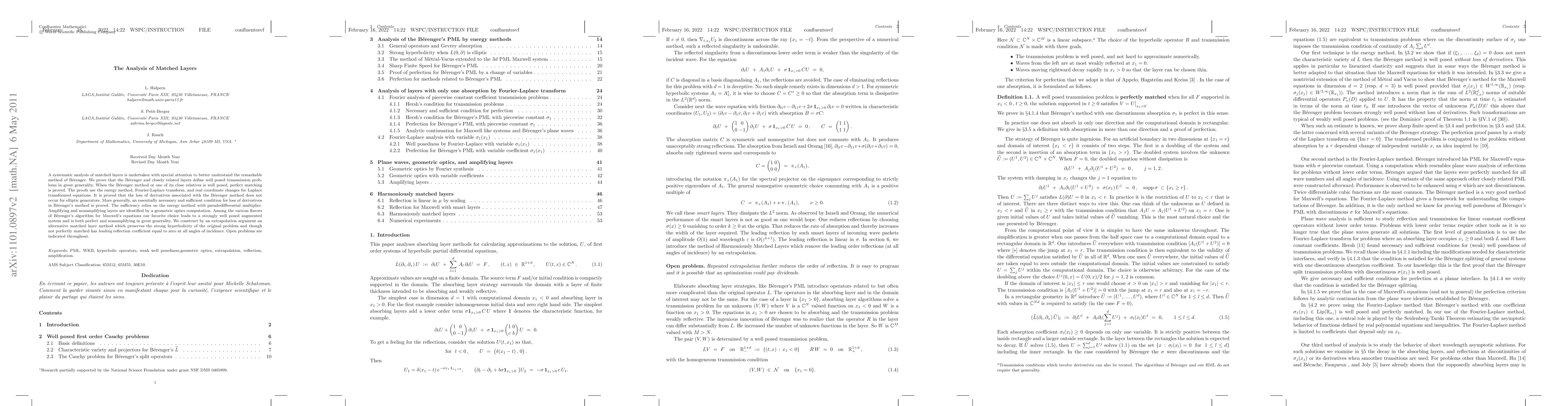 A systematic analysis of matched layers is undertaken with special attention to better understand the remarkable method of B\'erenger. We prove that the B\'erenger and closely related layers define well posed transmission problems in great generality. When the B\'erenger method or one of its close relatives is well posed, perfect matching is proved. The proofs use the energy method, Fourier-Laplace transform, and real coordinate changes for Laplace transformed equations. It is proved that the loss of derivatives associated with the B\'erenger method does not occur for elliptic generators. More generally, an essentially necessary and sufficient condition for loss of derivatives in B\'erenger's method is proved. The sufficiency relies on the energy method with pseudodifferential multiplier. Amplifying and nonamplifying layers are identified by a geometric optics computation. Among the various flavors of B\'erenger's algorithm for Maxwell's equations our favorite choice leads to a strongly well posed augmented system and is both perfect and nonamplifying in great generality. We construct by an extrapolation argument an alternative matched layer method which preserves the strong hyperbolicity of the original problem and though not perfectly matched has leading reflection coefficient equal to zero at all angles of incidence.