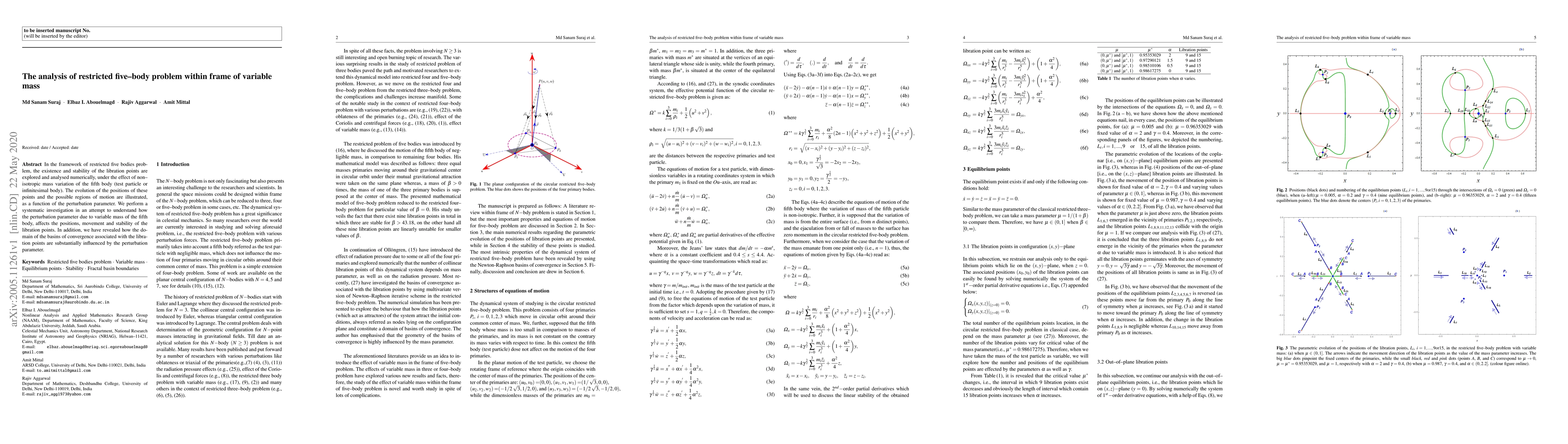 In the framework of restricted five bodies problem, the existence and stability of the libration points are explored and analysed numerically, under the effect of non--isotropic mass variation of the fifth body (test particle or infinitesimal body). The evolution of the positions of these points and the possible regions of motion are illustrated, as a function of the perturbation parameter. We perform a systematic investigation in an attempt to understand how the perturbation parameter due to variable mass of the fifth body, affects the positions, movement and stability of the libration points. In addition, we have revealed how the domain of the basins of convergence associated with the libration points are substantially influenced by the perturbation parameter.