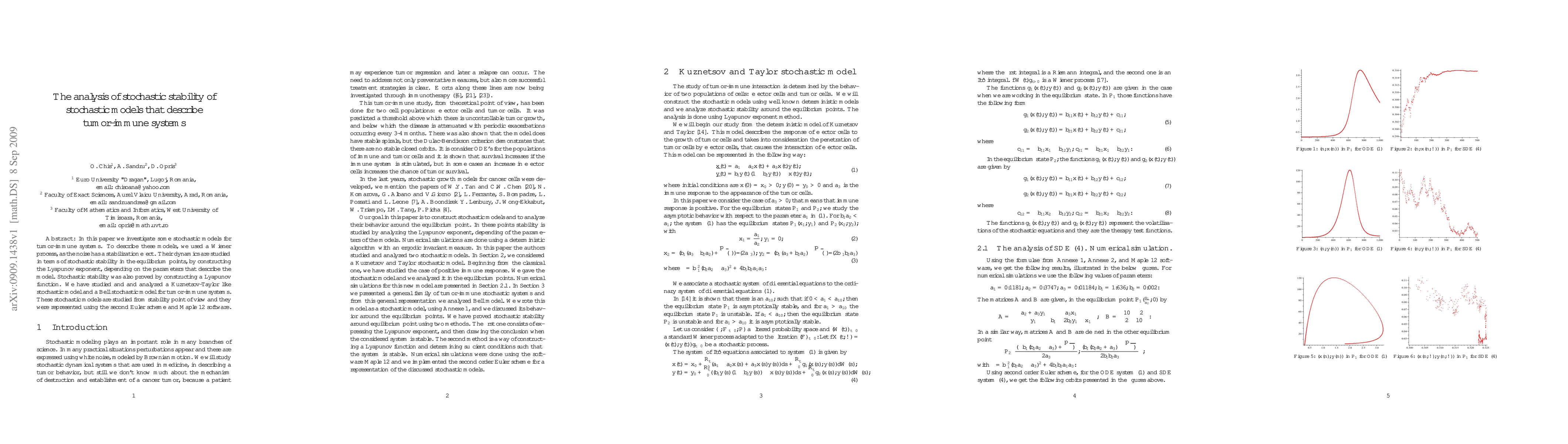 This paper investigates stochastic models for tumor-immune interactions using a Wiener process to account for noise stabilization effects. It examines stochastic stability at equilibrium points via Lyapunov exponents and functions, analyzing Kuznetsov-Taylor and Bell models with Maple 12 software.