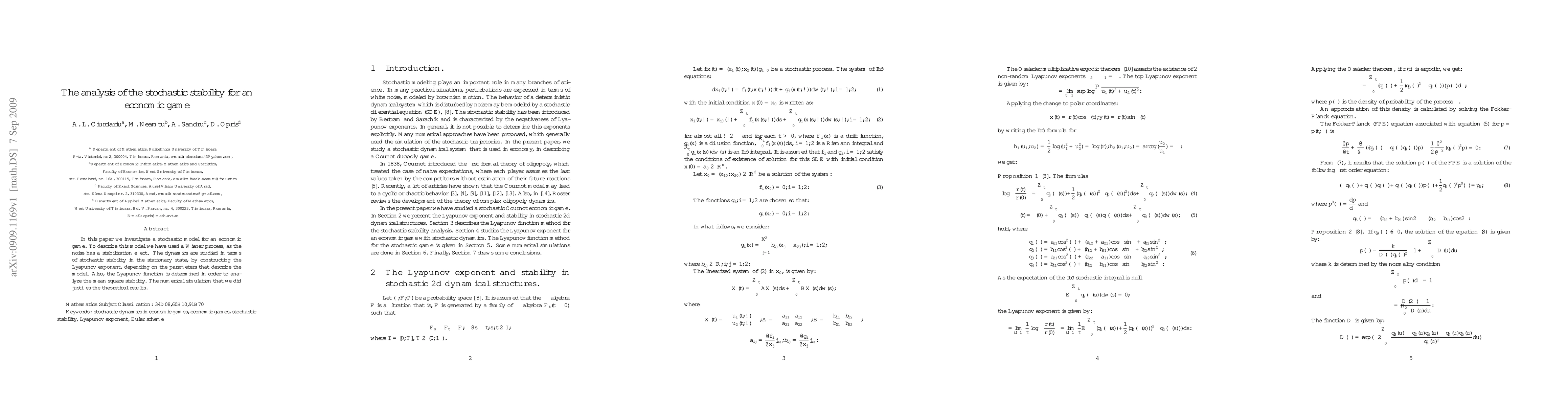 In this paper we investigate a stochastic model for an economic game. To describe this model we have used a Wiener process, as the noise has a stabilization effect. The dynamics are studied in terms of stochastic stability in the stationary state, by constructing the Lyapunov exponent, depending on the parameters that describe the model. Also, the Lyapunov function is determined in order to analyze the mean square stability. The numerical simulation that we did justifies the theoretical results.