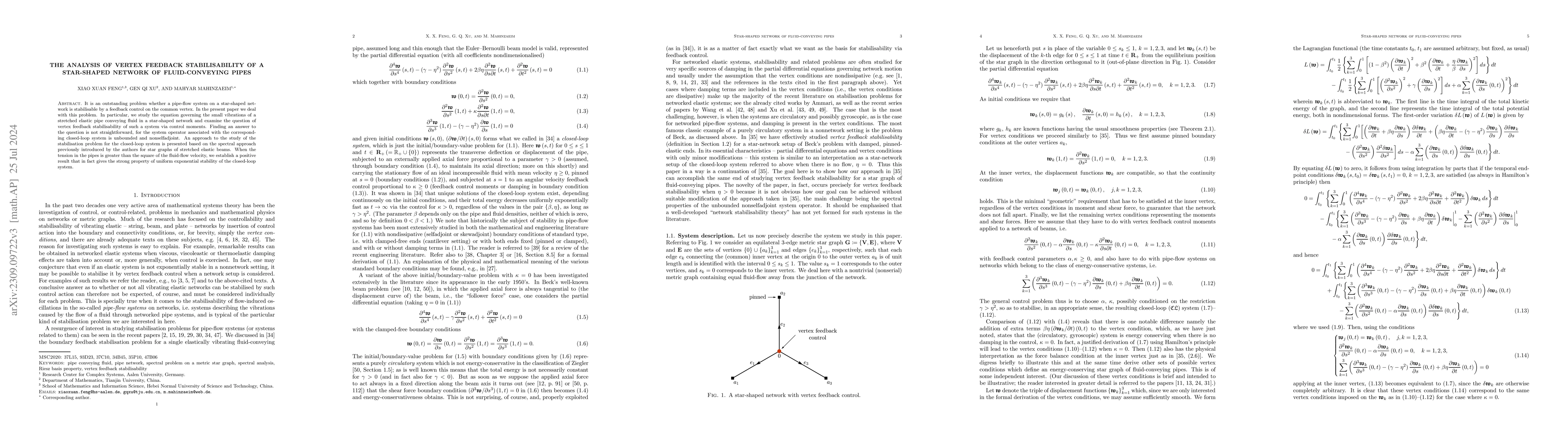 This paper investigates the stabilisability of a star-shaped network of fluid-conveying pipes via feedback control at the common vertex. The authors develop a spectral approach to address the stabilisation problem, establishing uniform exponential stability under conditions of sufficient pipe tension relative to fluid-flow velocity.
