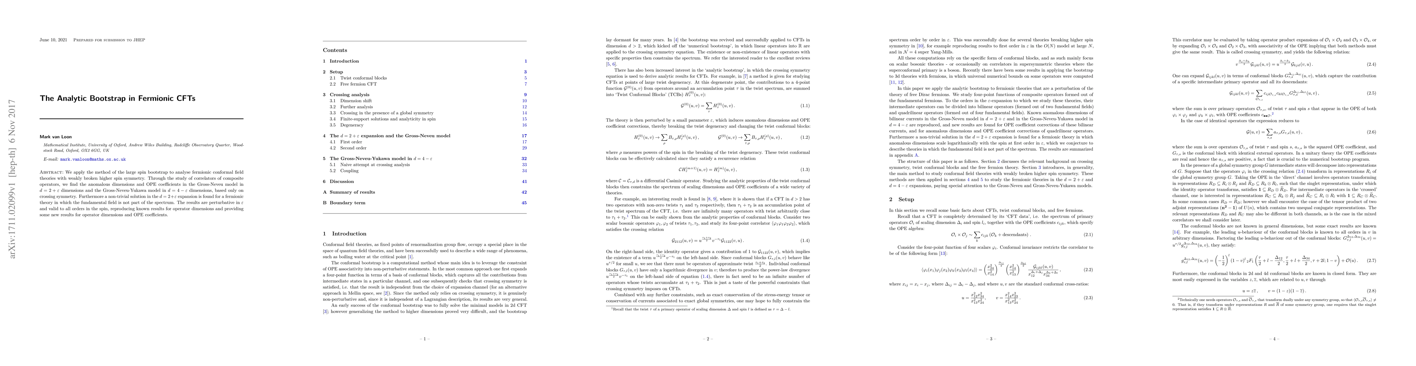 The paper presents a detailed application of the analytic bootstrap method to fermionic CFTs, deriving analytical expressions for anomalous dimensions and OPE coefficients, and identifying non-trivial solutions in specific models.
