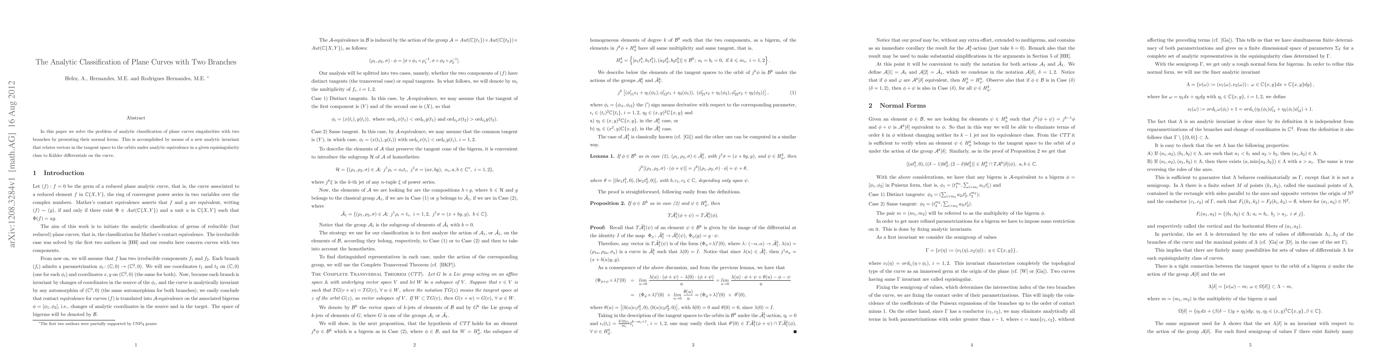 This paper presents a new analytic invariant for classifying plane curve singularities with two branches, achieving their normal forms through a relation between tangent space vectors and Kähler differentials. The method establishes analytic equivalence within equisingularity classes.