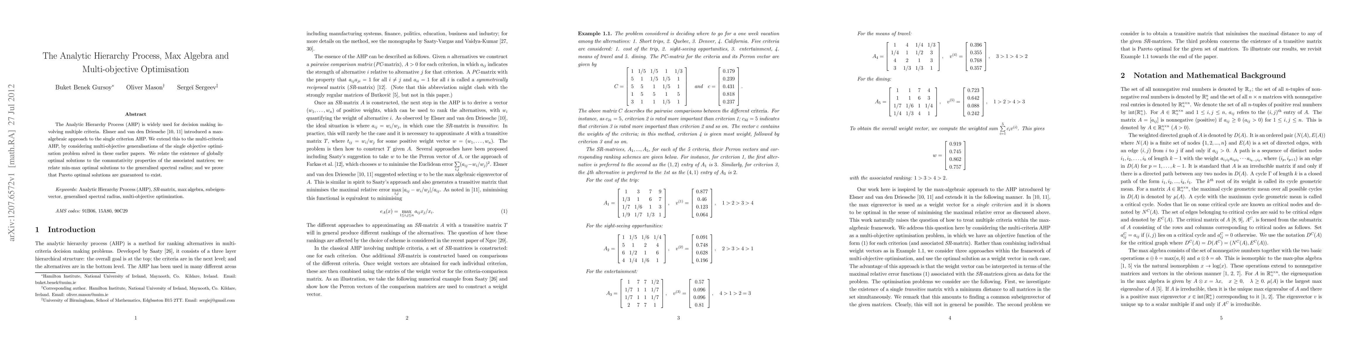 Researchers extend max-algebraic approach to multi-criteria decision making using Analytic Hierarchy Process (AHP), proving existence of globally optimal and Pareto optimal solutions.