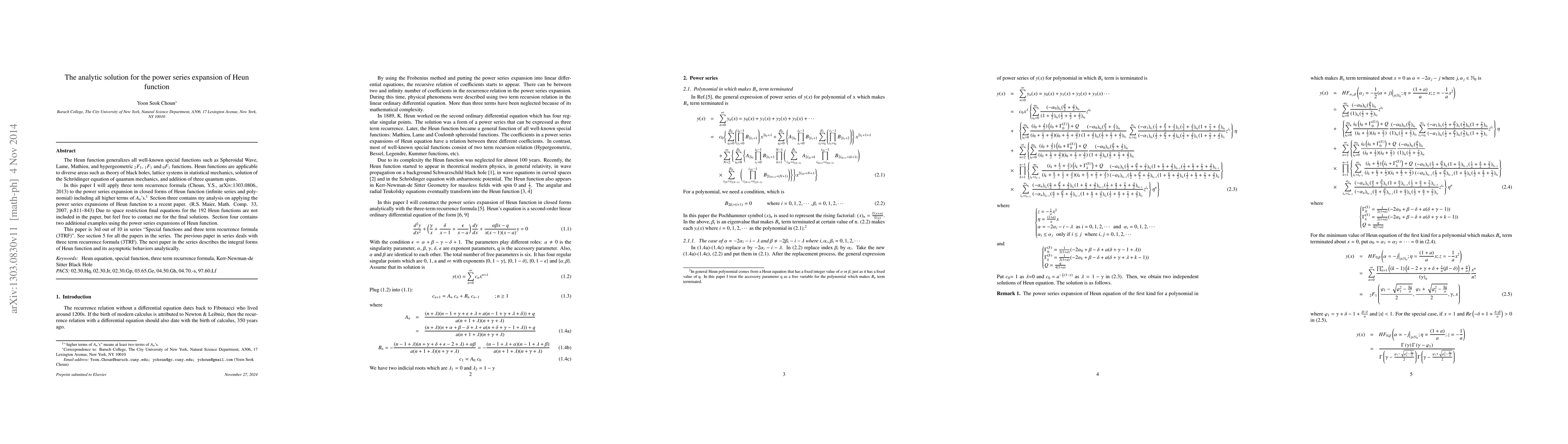 This paper derives analytic solutions for the power series expansion of Heun functions using a three-term recurrence formula, generalizing various special functions. It applies the expansion to recent mathematical and physical problems, with detailed examples provided and further solutions available upon request.