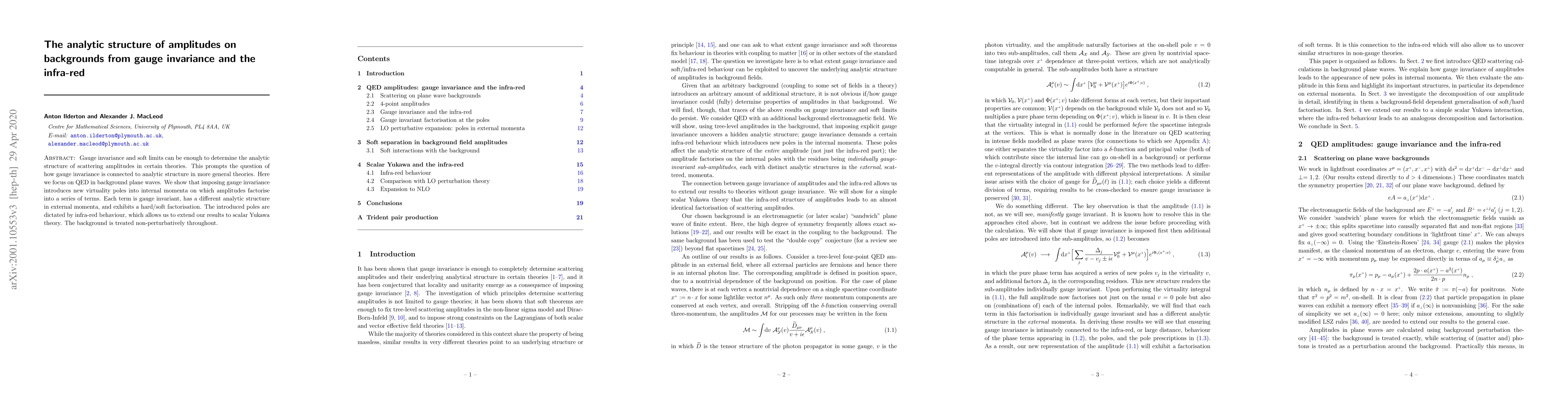 Gauge invariance and soft limits can be enough to determine the analytic structure of scattering amplitudes in certain theories. This prompts the question of how gauge invariance is connected to analytic structure in more general theories. Here we focus on QED in background plane waves. We show that imposing gauge invariance introduces new virtuality poles into internal momenta on which amplitudes factorise into a series of terms. Each term is gauge invariant, has a different analytic structure in external momenta, and exhibits a hard/soft factorisation. The introduced poles are dictated by infra-red behaviour, which allows us to extend our results to scalar Yukawa theory. The background is treated non-perturbatively throughout.