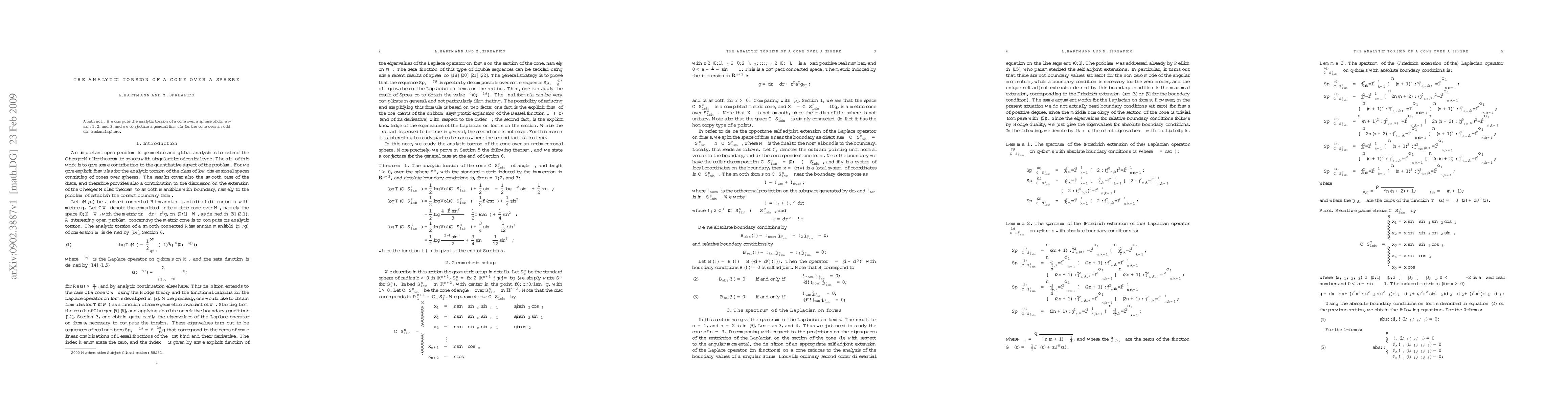 Summary: This paper calculates the analytic torsion for cones over spheres of dimensions 1, 2, and 3, and proposes a conjectured general formula for cones over odd-dimensional spheres. The findings contribute to understanding the geometric properties of such cones.
