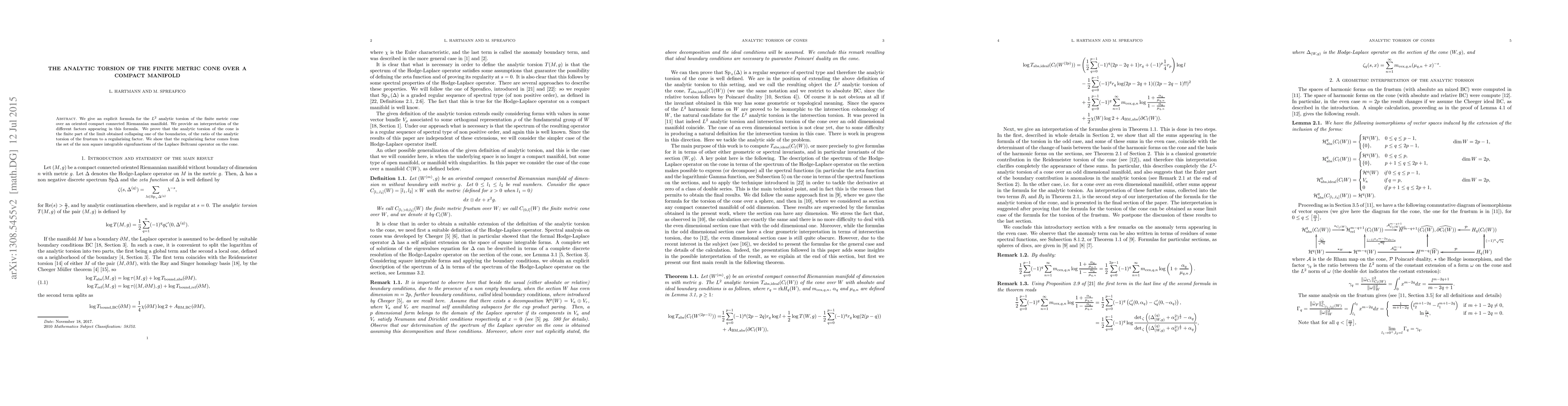 We give an explicit formula for the $L^2$ analytic torsion of the finite metric cone over an oriented compact connected Riemannian manifold. We provide an interpretation of the different factors appearing in this formula. We prove that the analytic torsion of the cone is the finite part of the limit obtained collapsing one of the boundaries, of the ratio of the analytic torsion of the frustum to a regularising factor. We show that the regularising factor comes from the set of the non square integrable eigenfunctions of the Laplace Beltrami operator on the cone.