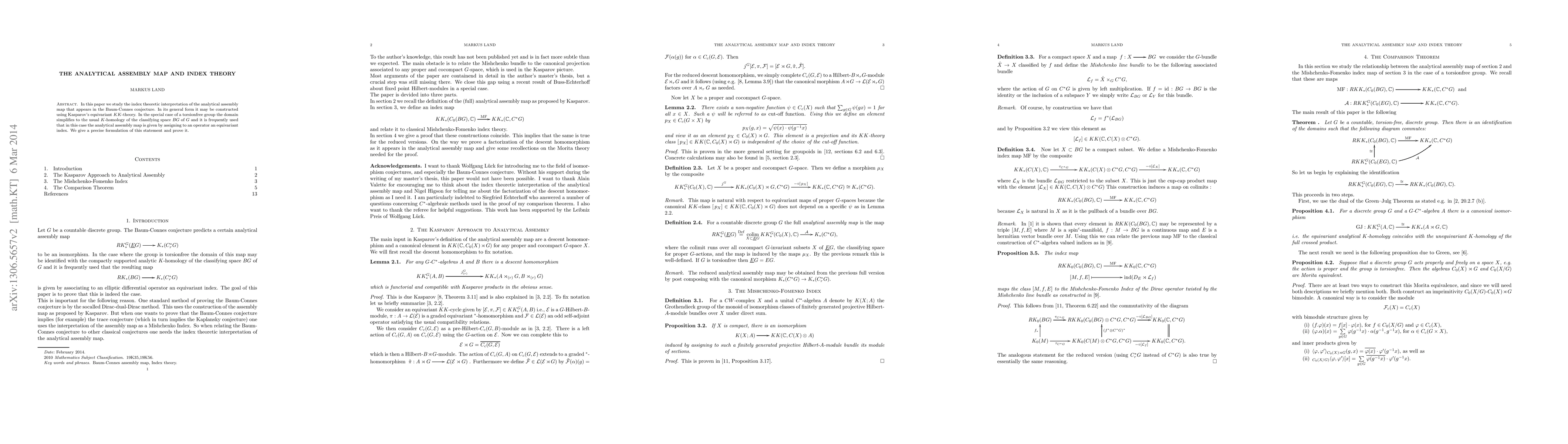 This paper explores the index-theoretic interpretation of the analytical assembly map in the Baum-Connes conjecture, utilizing Kasparov's equivariant KK-theory. For torsionfree groups, it simplifies to K-homology of the classifying space BG, where the analytical assembly map is shown to assign an equivariant index to an operator.