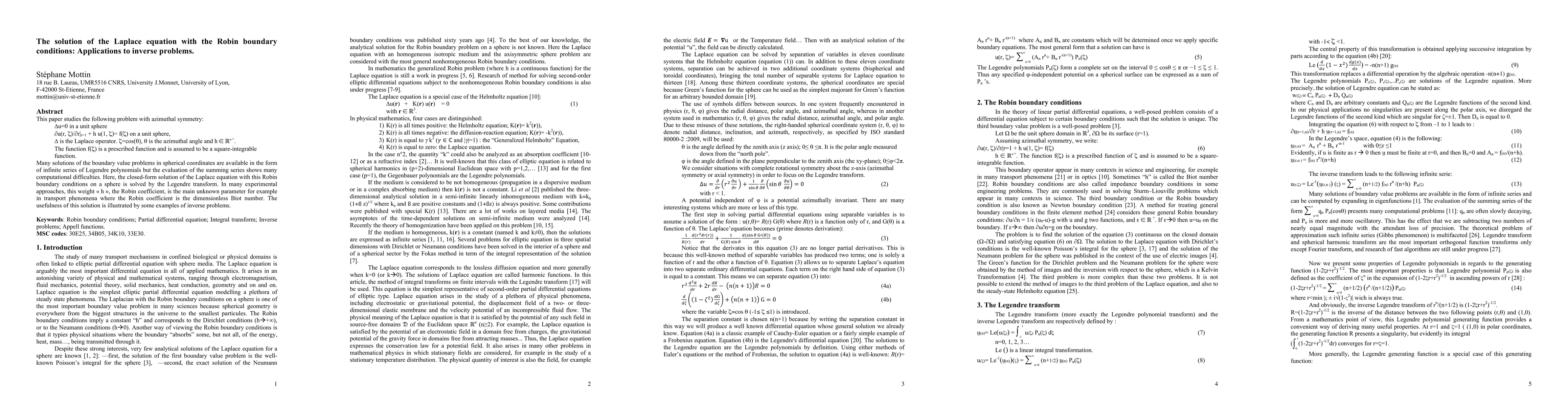 This paper studies the third boundary problem of the Laplace equation with azimuthal symmetry.Many solutions of the boundary value problems in spherical coordinates are available in the form of infinite series of Legendre polynomials but the evaluation of the summing series shows many computational difficulties. Integral transform is a challenge as it involves an inverse Legendre transform. Here, the closed-form solution of the Laplace equation with the Robin boundary conditions on a sphere is solved by the Legendre transform. This analytical solution is expressed with the Appell hypergeometric function F1. The Robin boundary conditions is a weighted combination of Dirichlet boundary conditions and Neumann boundary conditions. In many experimental approaches, this weight h, the Robin coefficient, is the main unknown parameter for example in transport phenomena where the Robin coefficient is the dimensionless Biot number. The usefulness of this formula is illustrated by some examples of inverse problems in mass and heat transfer, in optics, in corrosion detection and in physical geodesy.
