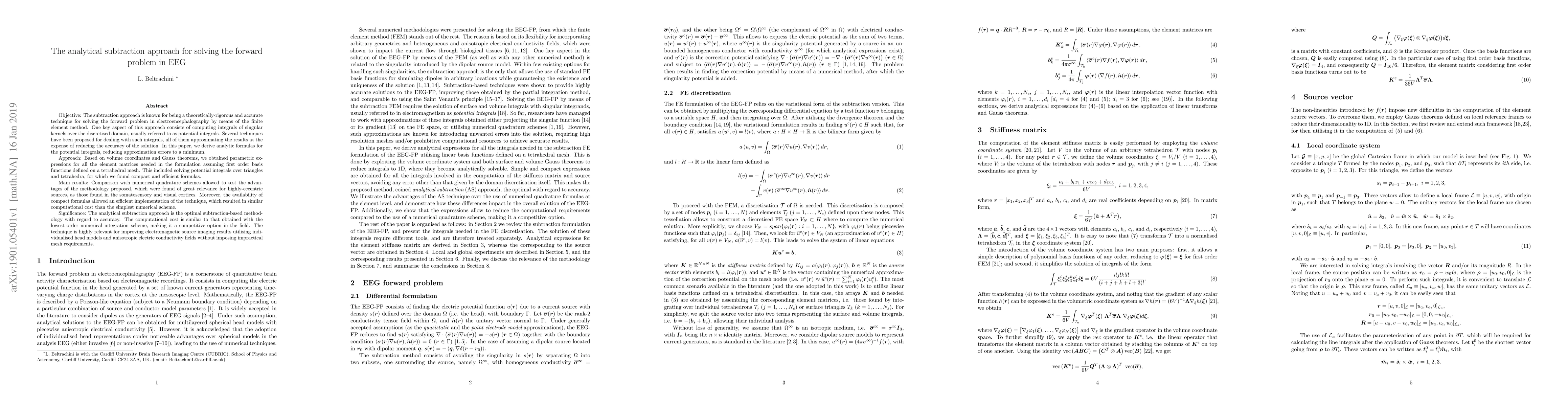 This paper proposes an analytical subtraction approach for solving the forward problem in EEG using the finite element method, deriving exact formulas for potential integrals to minimize approximation errors. The method, based on volume coordinates and Gauss theorems, provides accurate results comparable to simple numerical schemes, especially for eccentric sources in the somatosensory and visual cortices.