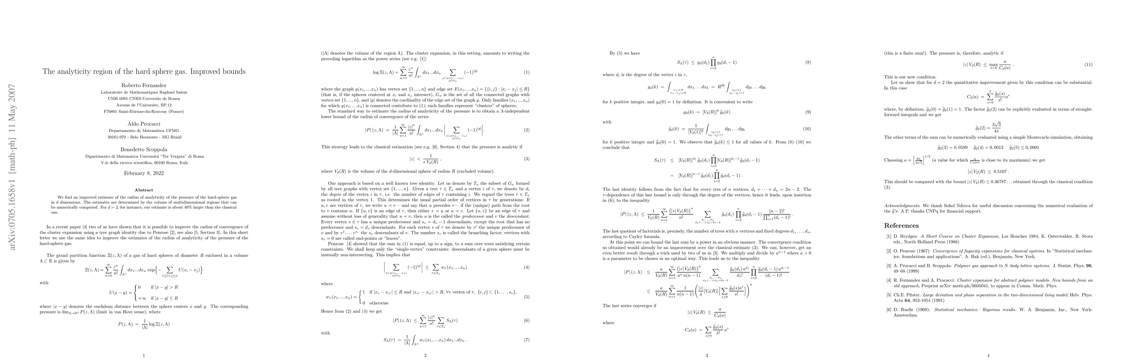 We find an improved estimate of the radius of analyticity of the pressure of the hard-sphere gas in $d$ dimensions. The estimates are determined by the volume of multidimensional regions that can be numerically computed. For $d=2$, for instance, our estimate is about 40% larger than the classical one.