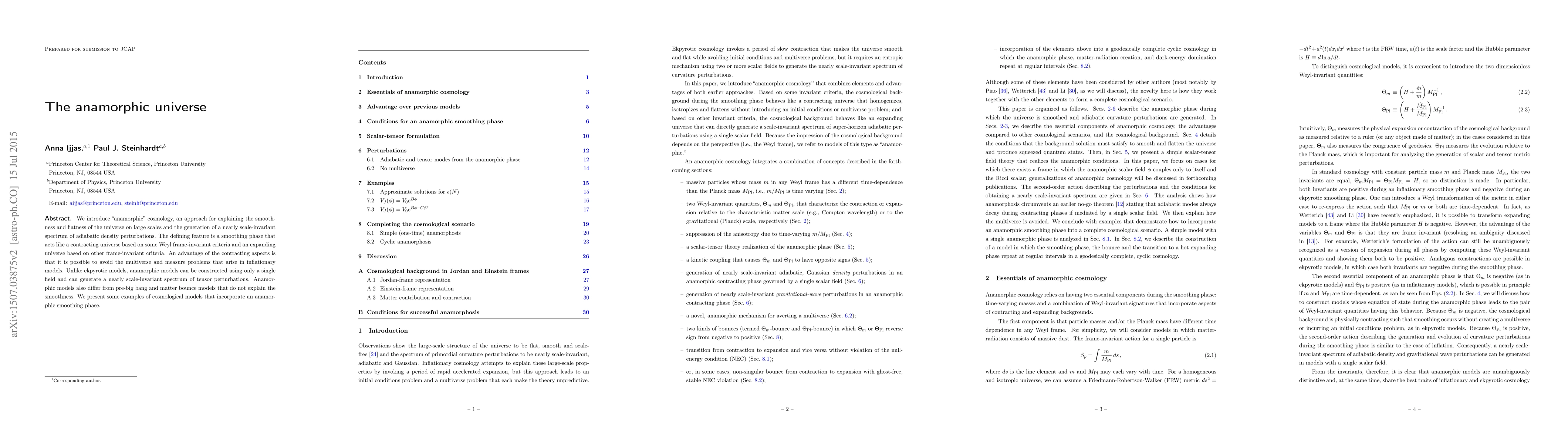 The paper proposes "anamorphic" cosmology to explain the universe's large-scale smoothness and flatness, utilizing a smoothing phase that behaves like a contracting universe in some criteria and an expanding universe in others. This approach avoids multiverse and measure problems found in inflationary models and can generate a nearly scale-invariant spectrum of tensor perturbations using a single field.