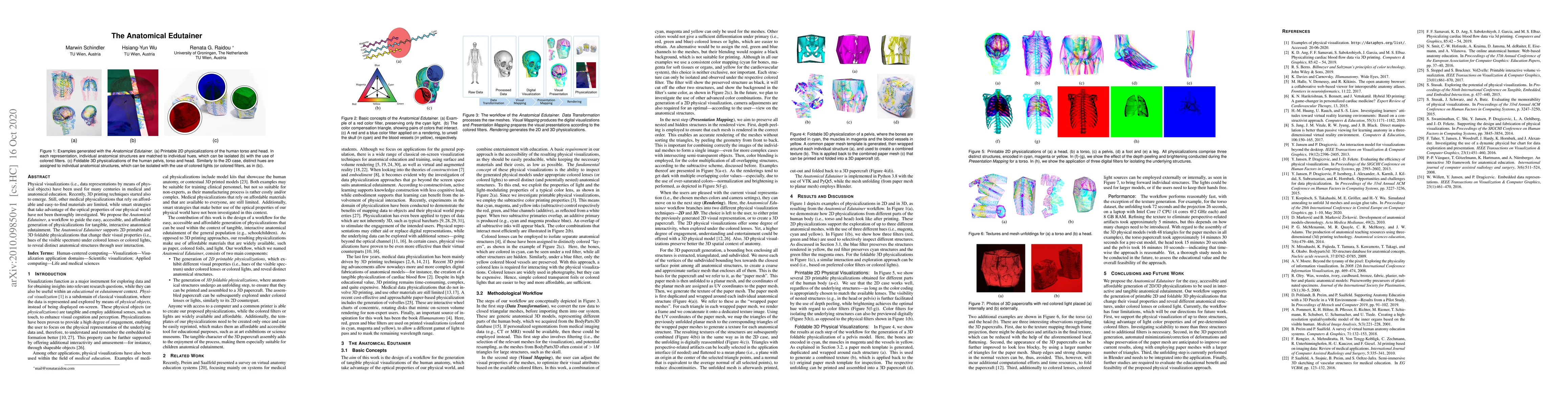Physical visualizations (i.e., data representations by means of physical objects) have been used for many centuries in medical and anatomical education. Recently, 3D printing techniques started also to emerge. Still, other medical physicalizations that rely on affordable and easy-to-find materials are limited, while smart strategies that take advantage of the optical properties of our physical world have not been thoroughly investigated. We propose the Anatomical Edutainer, a workflow to guide the easy, accessible, and affordable generation of physicalizations for tangible, interactive anatomical edutainment. The Anatomical Edutainer supports 2D printable and 3D foldable physicalizations that change their visual properties (i.e., hues of the visible spectrum) under colored lenses or colored lights, to reveal distinct anatomical structures through user interaction.