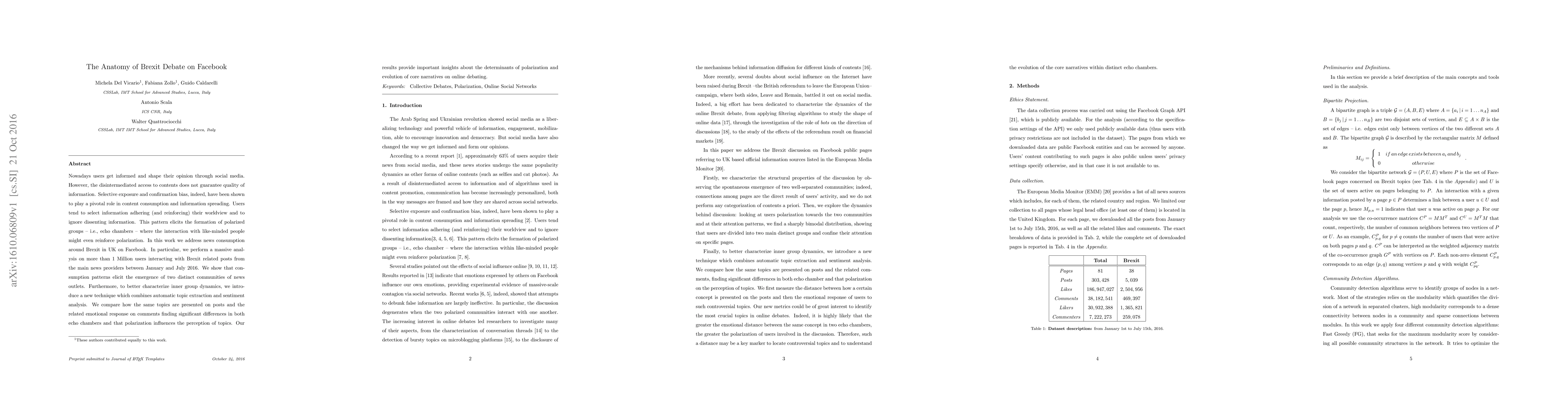 Nowadays users get informed and shape their opinion through social media. However, the disintermediated access to contents does not guarantee quality of information. Selective exposure and confirmation bias, indeed, have been shown to play a pivotal role in content consumption and information spreading. Users tend to select information adhering (and reinforcing) their worldview and to ignore dissenting information. This pattern elicits the formation of polarized groups -- i.e., echo chambers -- where the interaction with like-minded people might even reinforce polarization. In this work we address news consumption around Brexit in UK on Facebook. In particular, we perform a massive analysis on more than 1 Million users interacting with Brexit related posts from the main news providers between January and July 2016. We show that consumption patterns elicit the emergence of two distinct communities of news outlets. Furthermore, to better characterize inner group dynamics, we introduce a new technique which combines automatic topic extraction and sentiment analysis. We compare how the same topics are presented on posts and the related emotional response on comments finding significant differences in both echo chambers and that polarization influences the perception of topics. Our results provide important insights about the determinants of polarization and evolution of core narratives on online debating.