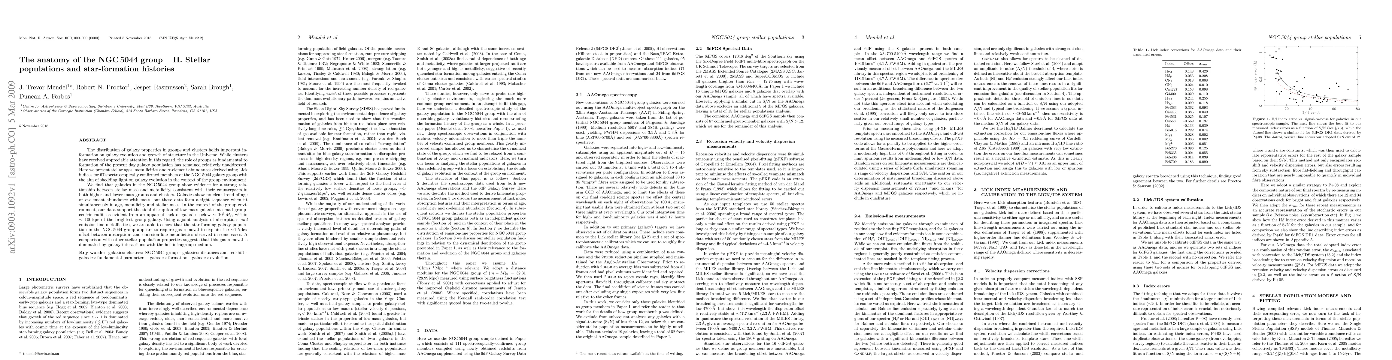 The distribution of galaxy properties in groups and clusters holds important information on galaxy evolution and growth of structure in the Universe. While clusters have received appreciable attention in this regard, the role of groups as fundamental to formation of the present day galaxy population has remained relatively unaddressed. Here we present stellar ages, metallicities and alpha-element abundances derived using Lick indices for 67 spectroscopically confirmed members of the NGC 5044 galaxy group with the aim of shedding light on galaxy evolution in the context of the group environment. We find that galaxies in the NGC 5044 group show evidence for a strong relationship between stellar mass and metallicity, consistent with their counterparts in both higher and lower mass groups and clusters. Galaxies show no clear trend of age or alpha-element abundance with mass, but these data form a tight sequence when fit simultaneously in age, metallicity and stellar mass. In the context of the group environment, our data support the tidal disruption of low-mass galaxies at small group-centric radii, as evident from an apparent lack of galaxies below ~10^9 M_sun within ~100 kpc of the brightest group galaxy. Using a joint analysis of absorption- and emission-line metallicities, we are able to show that the star-forming galaxy population in the NGC 5044 group appears to require gas removal to explain the ~1.5 dex offset between absorption- and emission-line metallicities observed in some cases. A comparison with other stellar population properties suggests that this gas removal is dominated by galaxy interactions with the hot intragroup medium.
