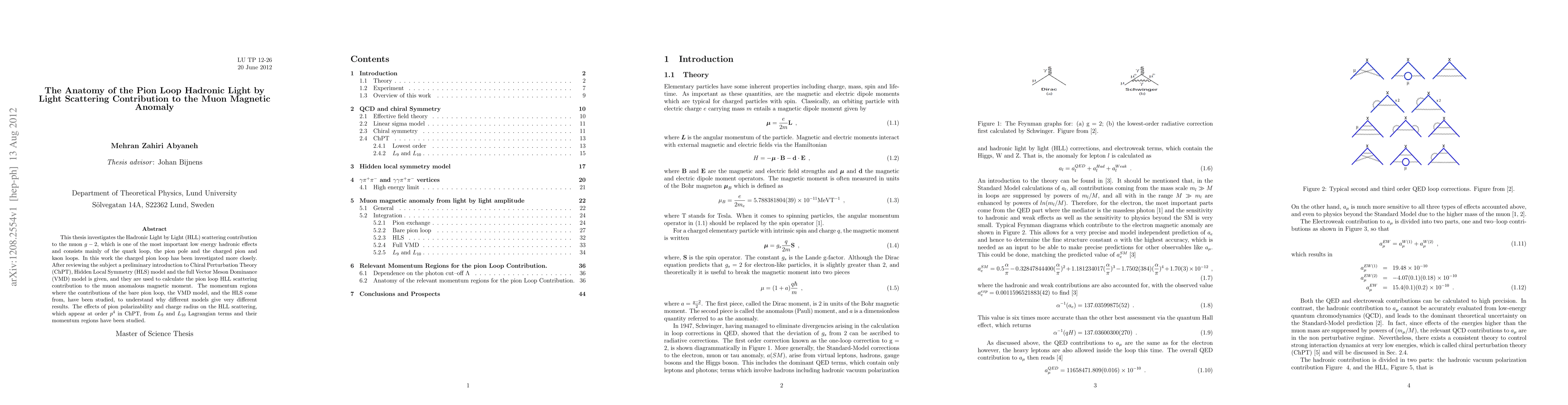 This thesis investigates the Hadronic Light by Light (HLL) scattering contribution to the muon $g-2$, which is one of the most important low energy hadronic effects and consists mainly of the quark loop, the pion pole and the charged pion and kaon loops. In this work the charged pion loop has been investigated more closely. After reviewing the subject a preliminary introduction to Chiral Perturbation Theory (ChPT), Hidden Local Symmetry (HLS) model and the full Vector Meson Dominance (VMD) model is given, and they are used to calculate the pion loop HLL scattering contribution to the muon anomalous magnetic moment. The momentum regions where the contributions of the bare pion loop, the VMD model, and the HLS come from, have been studied, to understand why different models give very different results. The effects of pion polarizability and charge radius on the HLL scattering, which appear at order $p^4$ in ChPT, from $ L_9$ and $ L_{10}$ Lagrangian terms and their momentum regions have been studied.