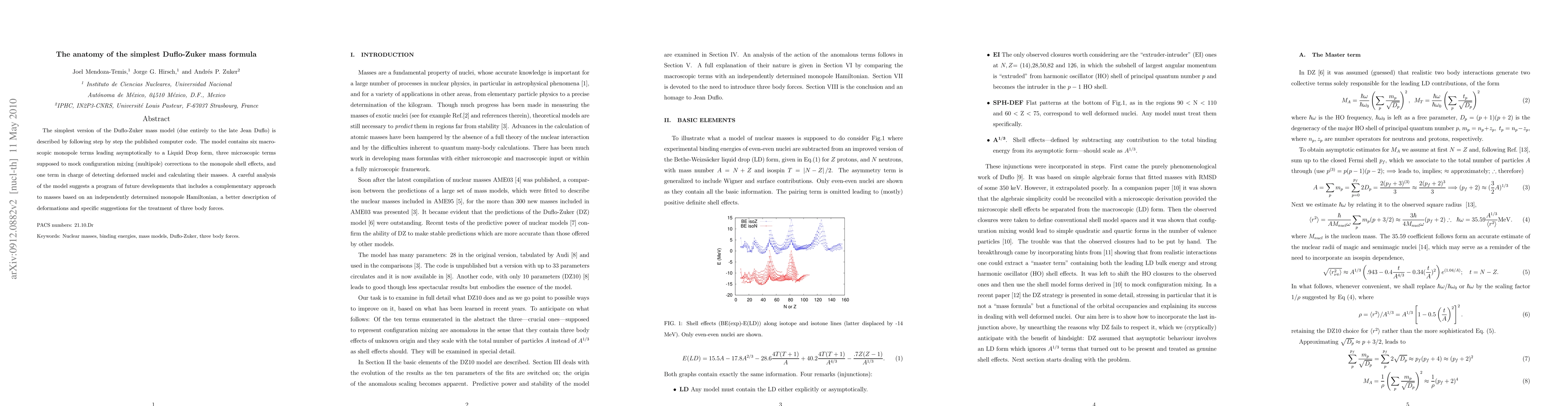 The paper re-analyzes the Duflo-Zuker mass model, a theoretical framework for calculating nuclear masses, revealing opportunities for improvement and future development in better describing deformations and three-body forces.