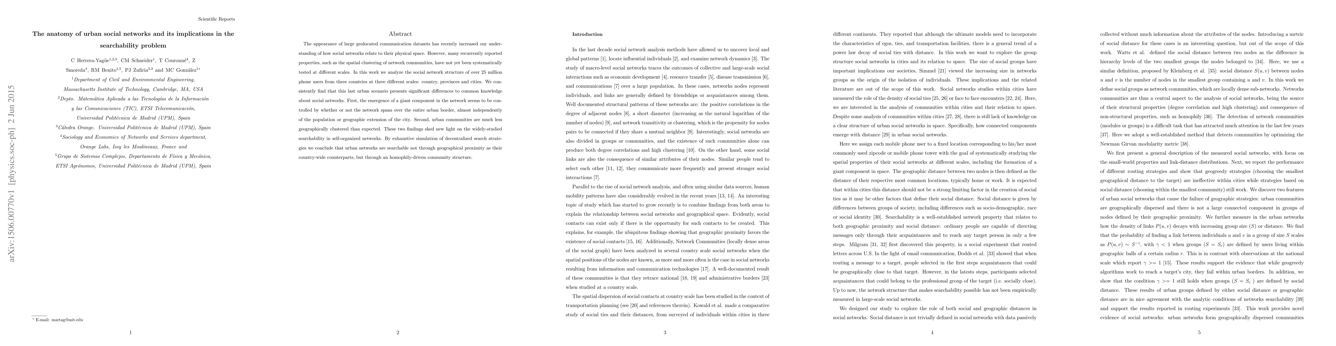 The appearance of large geolocated communication datasets has recently increased our understanding of how social networks relate to their physical space. However, many recurrently reported properties, such as the spatial clustering of network communities, have not yet been systematically tested at different scales. In this work we analyze the social network structure of over 25 million phone users from three countries at three different scales: country, provinces and cities. We consistently find that this last urban scenario presents significant differences to common knowledge about social networks. First, the emergence of a giant component in the network seems to be controlled by whether or not the network spans over the entire urban border, almost independently of the population or geographic extension of the city. Second, urban communities are much less geographically clustered than expected. These two findings shed new light on the widely-studied searchability in self-organized networks. By exhaustive simulation of decentralized search strategies we conclude that urban networks are searchable not through geographical proximity as their country-wide counterparts, but through an homophily-driven community structure.