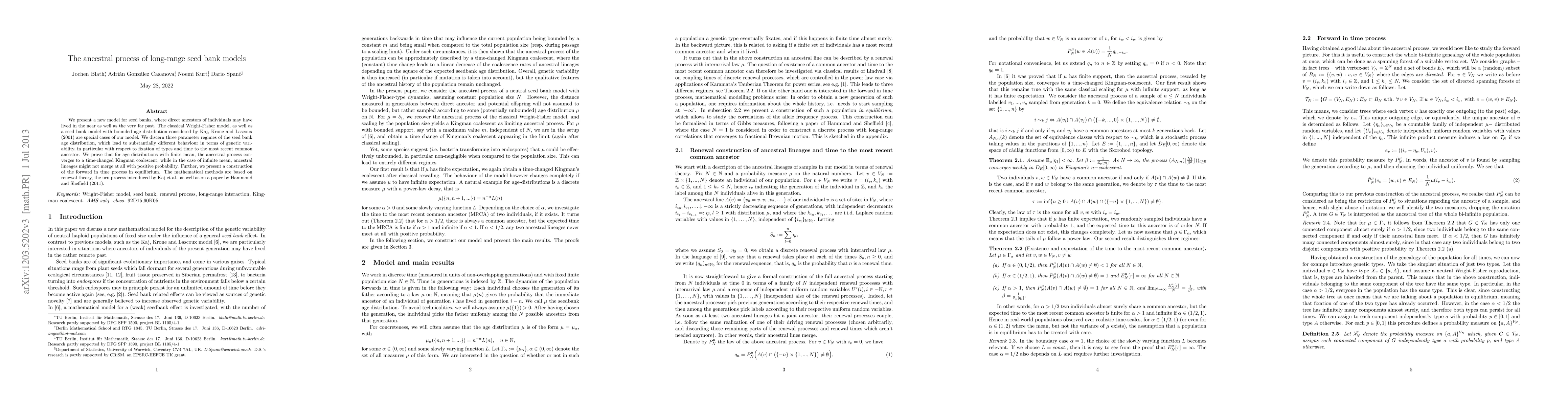 This paper introduces a novel seed bank model incorporating direct ancestors from both distant and recent past, extending previous models like Wright-Fisher and one by Kaj, Krone, and Lascoux (2001). The study reveals three parameter regimes affecting genetic variability and time to the most recent common ancestor. It also proves convergence to a time-changed Kingman coalescent for finite mean age distributions, and explores the possibility of non-merging lineages for infinite mean age distributions. The methodology combines renewal theory, the urn process, and techniques from Hammond and Sheffield (2011).