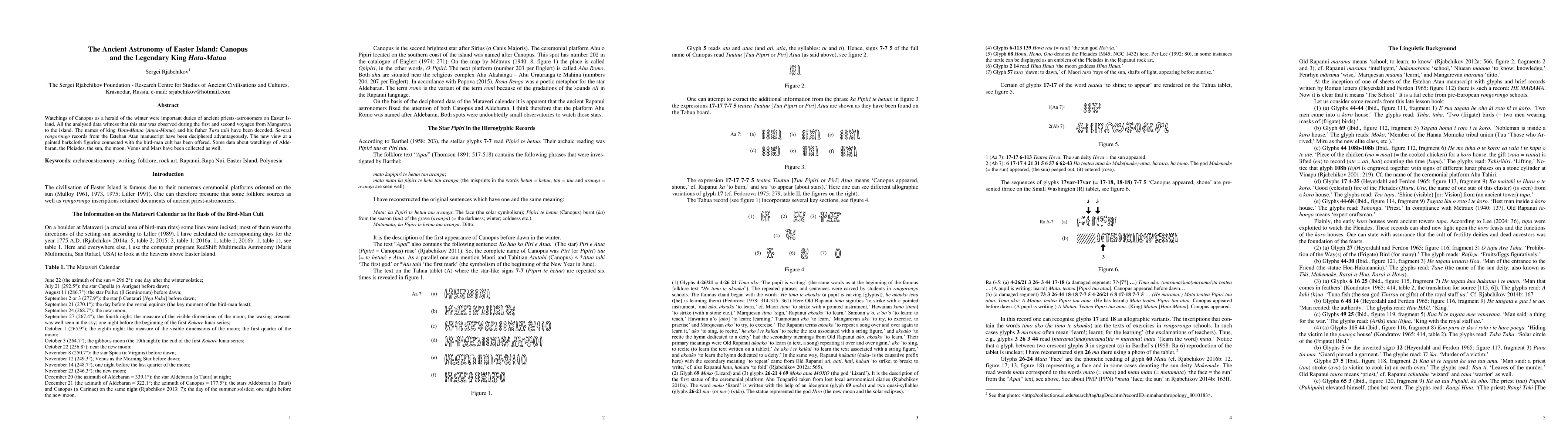 Watchings of Canopus as a herald of the winter were important duties of ancient priests-astronomers on Easter Island. All the analysed data witness that this star was observed during the first and second voyages from Mangareva to the island. The names of king Hotu-Matua (Anua-Motua) and his father Tara tahi have been decoded. Several rongorongo records from the Esteban Atan manuscript have been deciphered advantageously. The new view at a painted barkcloth figurine connected with the bird-man cult has been offered. Some data about watchings of Aldebaran, the Pleiades, the sun, the moon, Venus and Mars have been collected as well.