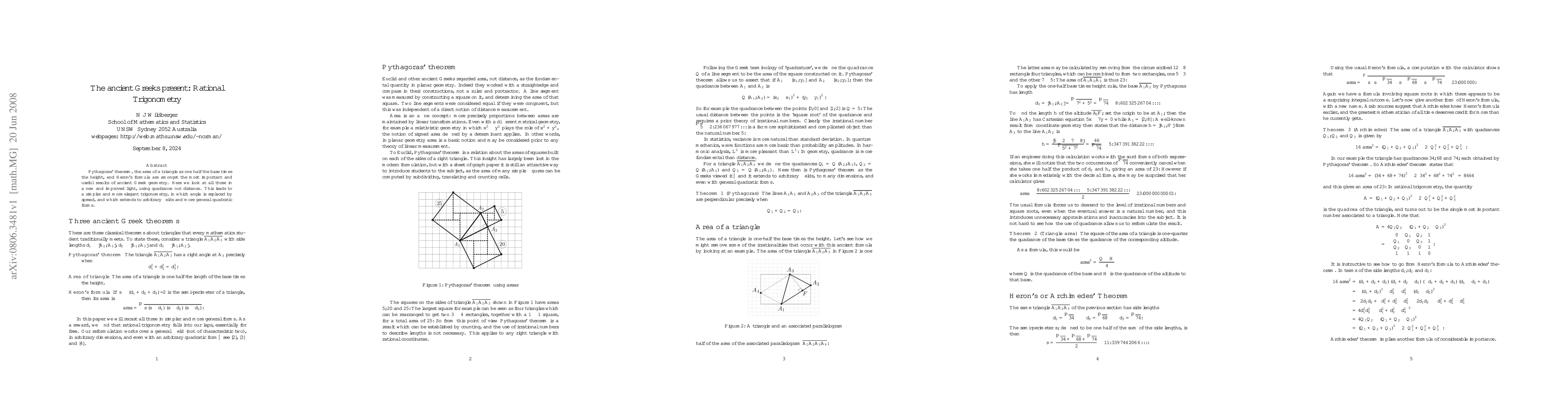 Pythagoras' theorem, the area of a triangle as one half the base times the height, and Heron's formula are amongst the most important and useful results of ancient Greek geometry. Here we look at all three in a new and improved light, using quadrance not distance. This leads to a simpler and more elegant trigonometry, in which angle is replaced by spread, and which extends to arbitrary fields and more general quadratic forms.