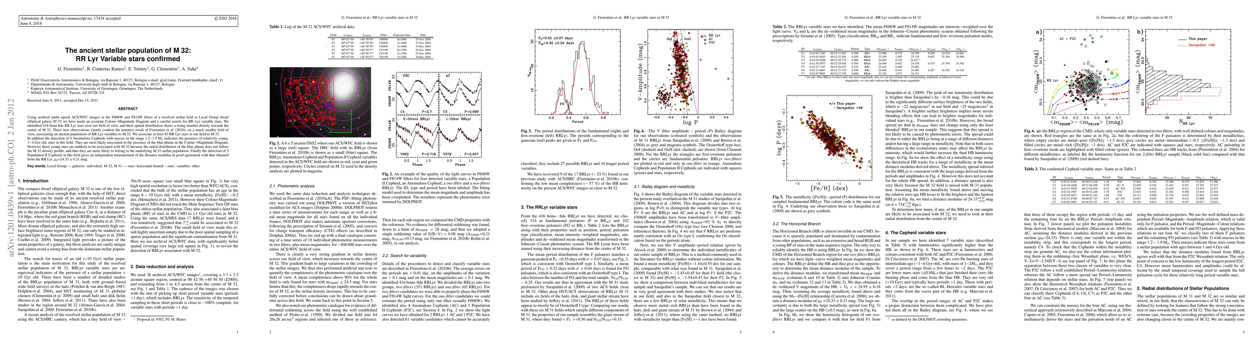 Using archival multi--epoch ACS/WFC images in the F606W and F814W filters of a resolved stellar field in Local Group dwarf elliptical galaxy M32 we have made an accurate Colour-Magnitude Diagram and a careful search for RR Lyr variable stars. We identified 416 bona fide RR Lyr stars over our field of view, and their spatial distribution shows a rising number density towards the centre of M32. These new observations clearly confirm the tentative result of Fiorentino et al. (2010), on a much smaller field of view, associating an ancient population of RR Lyr variables to M32. We associate at least 83 RR Lyr stars in our field to M32. In addition the detection of 4 Anomalous Cepheids with masses in the range 1.2-1.9 Mo indicates the presence of relatively young, 1-4 Gyr old, stars in this field. They are most likely associated to the presence of the blue plume in the Colour-Magnitude Diagram. However these young stars are unlikely to be associated with M32 because the radial distribution of the blue plume does not follow the M32 density profile, and thus they are more likely to belong to the underlying M31 stellar population. Finally the detection of 3 Population II Cepheids in this field gives an independent measurement of the distance modulus in good agreement with that obtained from the RRLyr, mu0=24.33 +- 0.21 mag.