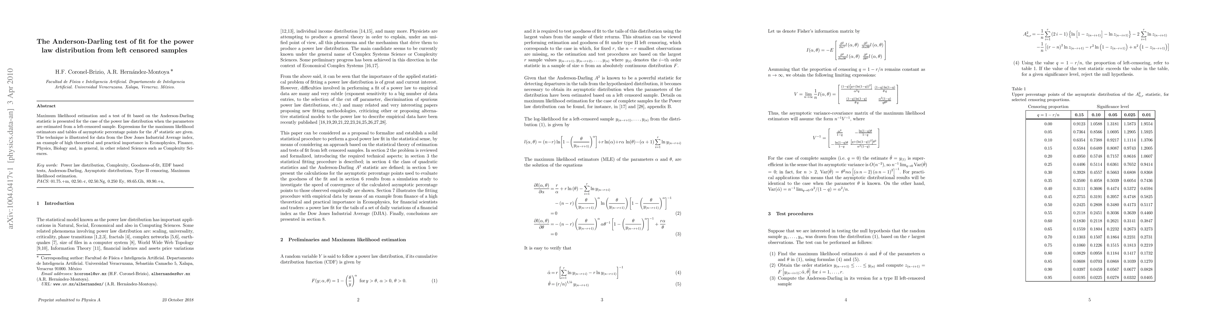 Maximum likelihood estimation and a test of fit based on the Anderson-Darling statistic is presented for the case of the power law distribution when the parameters are estimated from a left-censored sample. Expressions for the maximum likelihood estimators and tables of asymptotic percentage points for the A^2 statistic are given. The technique is illustrated for data from the Dow Jones Industrial Average index, an example of high theoretical and practical importance in Econophysics, Finance, Physics, Biology and, in general, in other related Sciences such as Complexity Sciences.