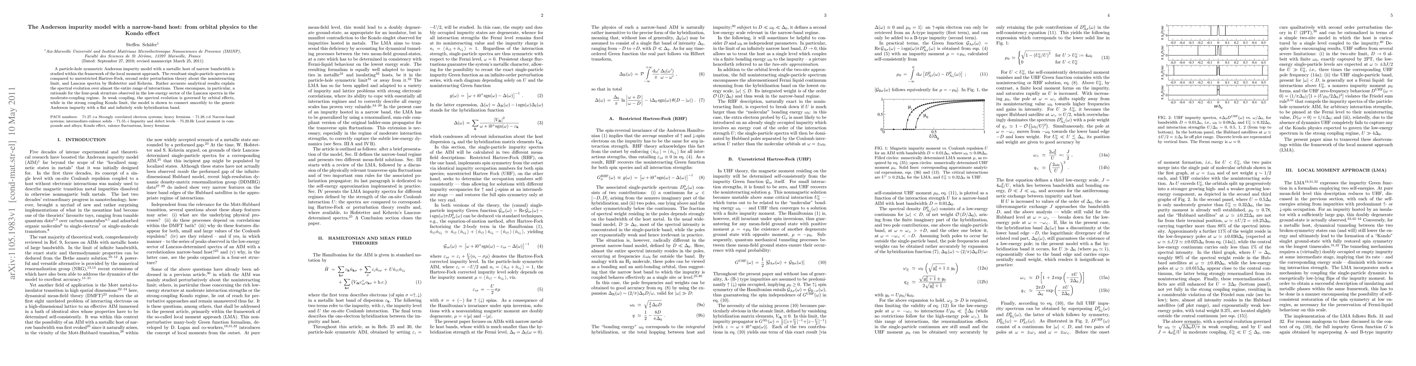 This paper studies the Anderson impurity model in a narrow-band metallic host, explaining spectral evolution through analytical results and comparing them to various theoretical approaches. It reveals a four-peak structure in low-energy spectra and shows how the model transitions from orbital-dominated behavior in weak coupling to the Kondo effect in strong coupling.