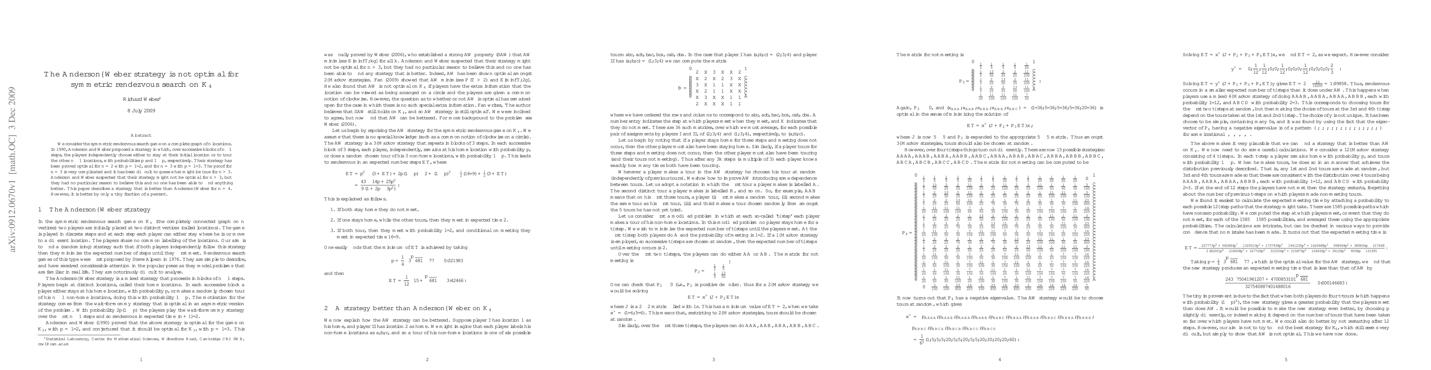 We consider the symmetric rendezvous search game on a complete graph of n locations. In 1990, Anderson and Weber proposed a strategy in which, over successive blocks of n-1 steps, the players independently choose either to stay at their initial location or to tour the other n-1 locations, with probabilities p and 1-p, respectively. Their strategy has been proved optimal for n=2 with p=1/2, and for n=3 with p=1/3. The proof for n=3 is very complicated and it has been difficult to guess what might be true for n>3. Anderson and Weber suspected that their strategy might not be optimal for n>3, but they had no particular reason to believe this and no one has been able to find anything better. This paper describes a strategy that is better than Anderson--Weber for n=4. However, it is better by only a tiny fraction of a percent.