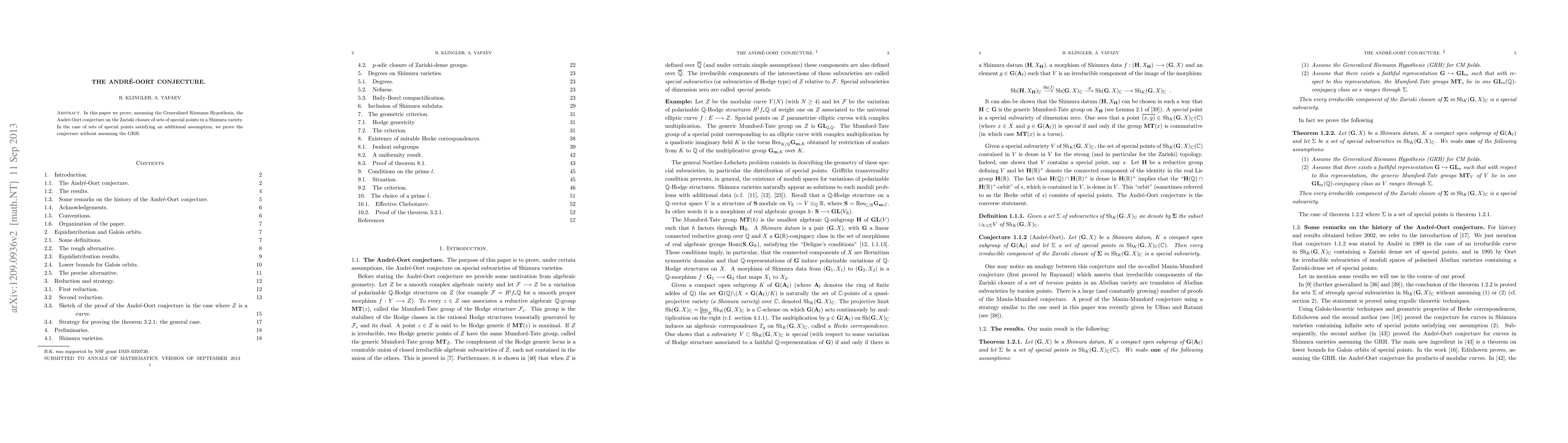 In this paper we prove, assuming the Generalized Riemann Hypothesis, the Andr?e-Oort conjecture on the Zariski closure of sets of special points in a Shimura variety. In the case of sets of special points satisfying an additional assumption, we prove the conjecture without assuming the GRH.