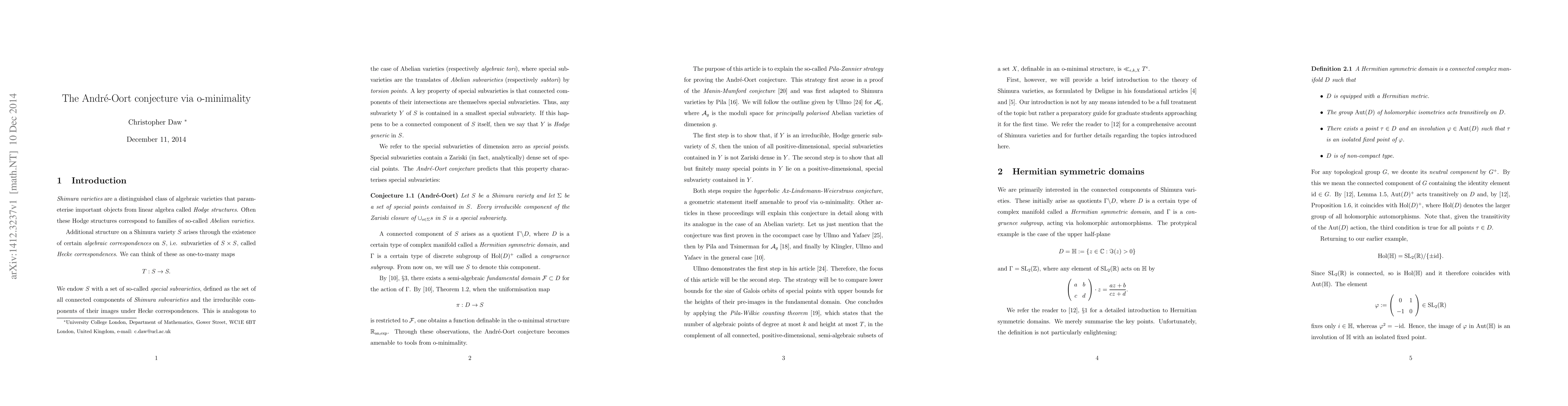 Summary: This paper introduces the Pila-Zannier strategy to prove the Andr\'e-Oort conjecture, employing o-minimality techniques. It begins with a foundational overview of Shimura varieties to contextualize the conjecture within modern arithmetic geometry.