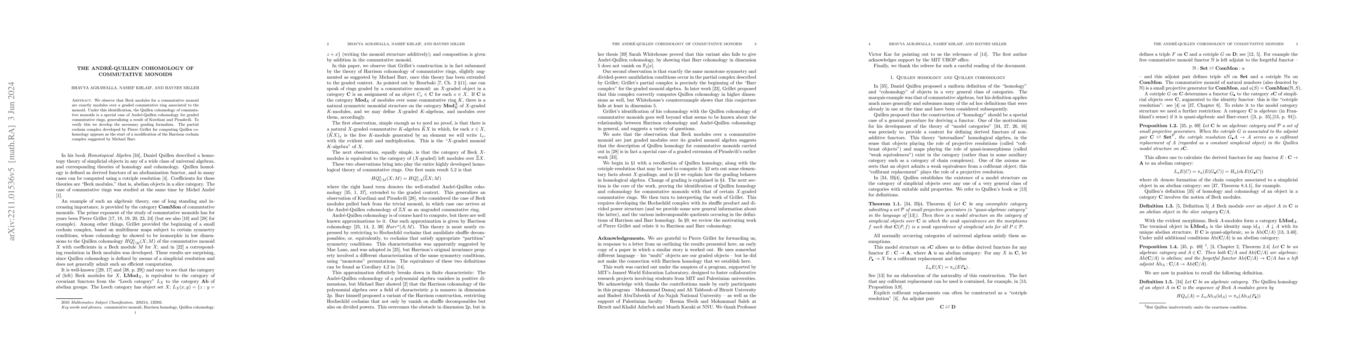 Summary: The paper establishes that Beck modules for commutative monoids correspond to modules over associated graded commutative rings, thus linking Quillen cohomology of monoids to André-Quillen cohomology of rings, and develops the required grading formalism to support this connection.