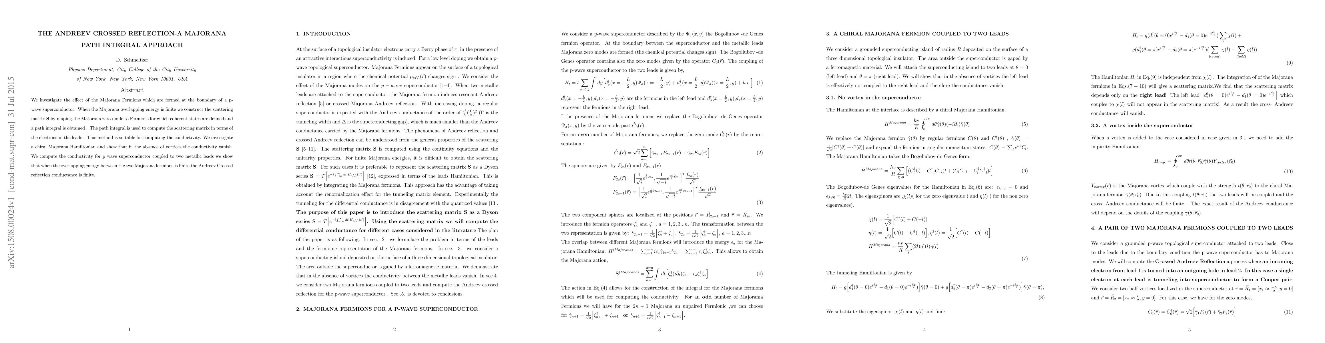 We investigate the effect of the Majorana Fermions which are formed at the boundary of a p-wave superconductor. When the Majorana overlapping energy is finite we construct the scattering matrix $\mathbf{S}$ by maping the Majorana zero mode to Fermions for which coherent states are defined and a path integral is obtained . The path integral is used to compute the scattering matrix in terms of the electrons in the leads . This method is suitable for computing the conductivity. We investigate a chiral Majorana Hamiltonian and show that in the absence of vortices the conductivity vanish. We compute the conductivity for p wave superconductor coupled to two metallic leads we show that when the overlapping energy between the two Majorana fermions is finite the Andreev Crossed reflection conductance is finite.