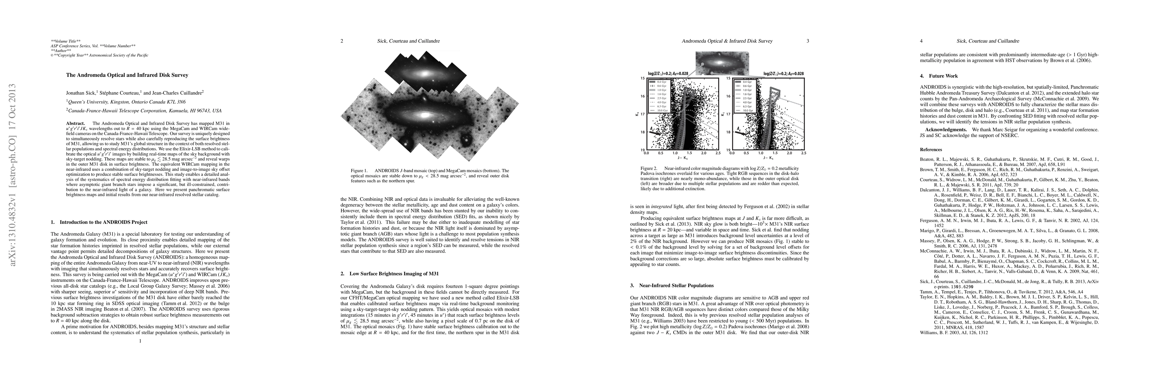 The Andromeda Optical and Infrared Disk Survey (ANDROIDS) utilizes the MegaCam and WIRCam instruments on the Canada-France-Hawaii Telescope to map M31 in various wavelengths, from near-UV to near-infrared. The survey employs the Elixir-LSB method for optical calibration and a combination of sky-target nodding and image-to-image sky offset optimization for near-infrared calibration, ensuring stable surface brightness measurements out to R=40 kpc.