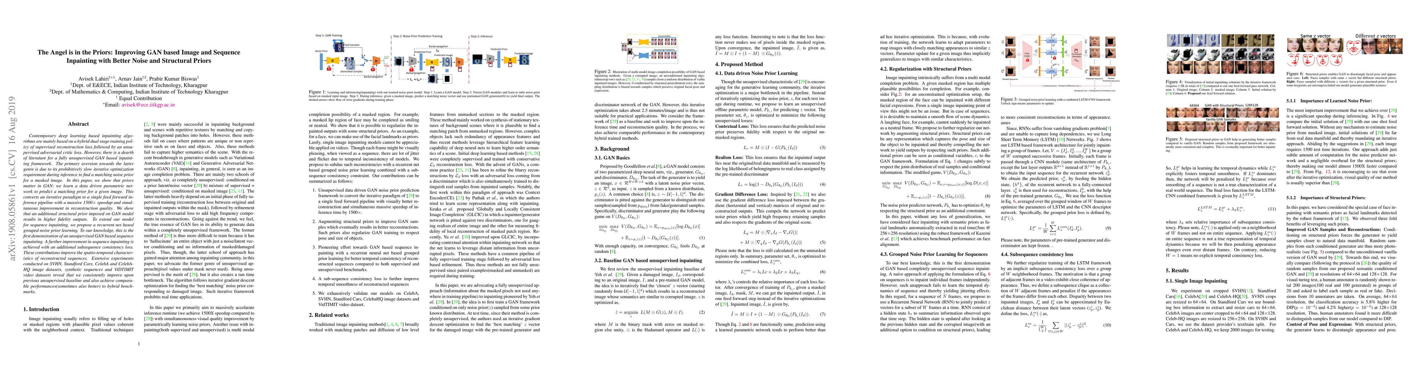 This paper introduces a fully unsupervised GAN-based framework for image and sequence inpainting, utilizing learned noise and structural priors to achieve a 1500X speedup and improved reconstruction quality. It also proposes recurrent networks for sequence inpainting and a subsequence consistency loss, demonstrating superior spatio-temporal characteristics and competitive performance against hybrid benchmarks.