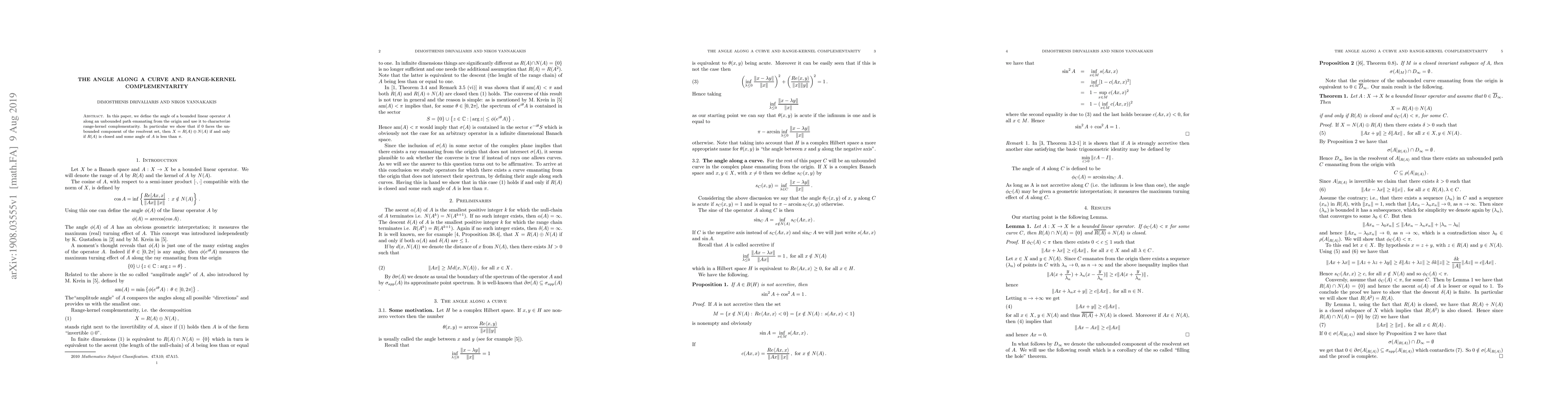 In this paper, we define the angle of a bounded linear operator $A$ along an unbounded path emanating from the origin and use it to characterize range-kernel complementarity. In particular we show that if $0$ faces the unbounded component of the resolvent set, then $X=R(A)\oplus N(A)$ if and only if $R(A)$ is closed and some angle of $A$ is less than $\pi$.