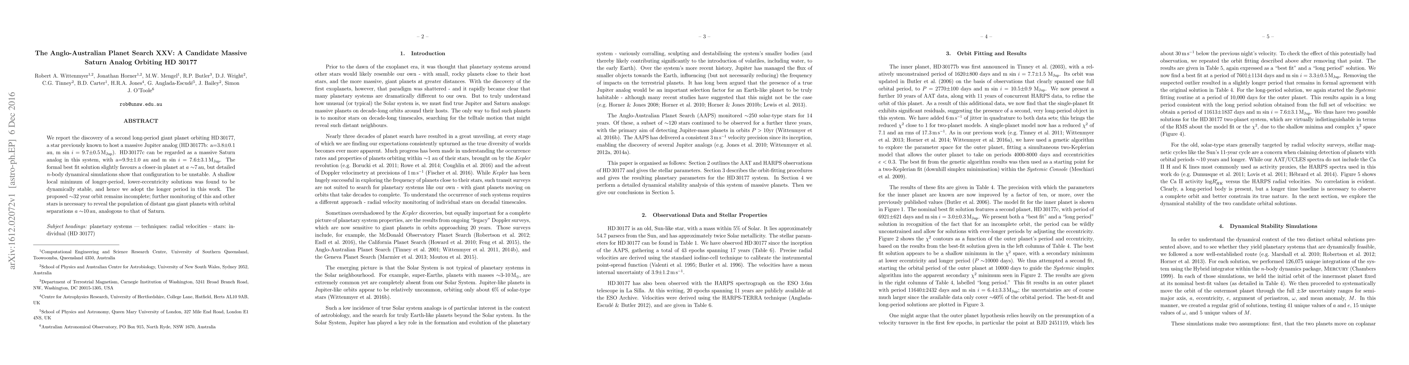 The Anglo-Australian Planet Search team discovered a second long-period giant planet, HD 30177c, orbiting the star HD 30177, which is a massive Saturn analog with an orbit of approximately 9.9 au. Further monitoring is needed to confirm its ~32-year orbit and to explore the population of distant gas giants.