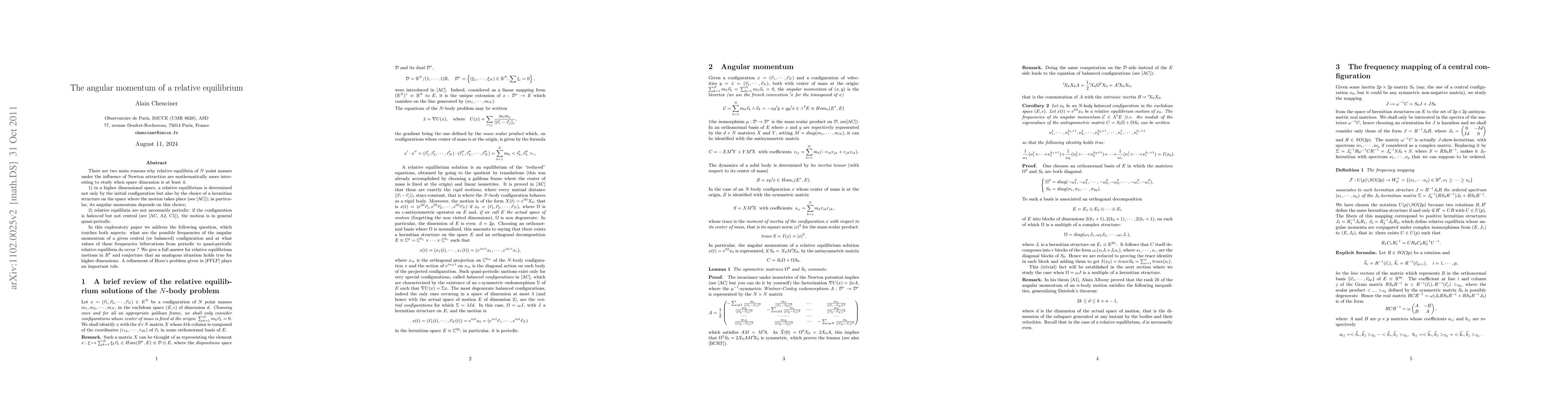 This paper explores the angular momentum of relative equilibria of N point masses under Newtonian attraction, particularly in dimensions ≥4, where the angular momentum depends on the choice of complex structure. It investigates the frequencies of angular momentum and the bifurcations from periodic to quasi-periodic motions, providing a full answer for dimension 4 and proving a conjecture for higher dimensions.