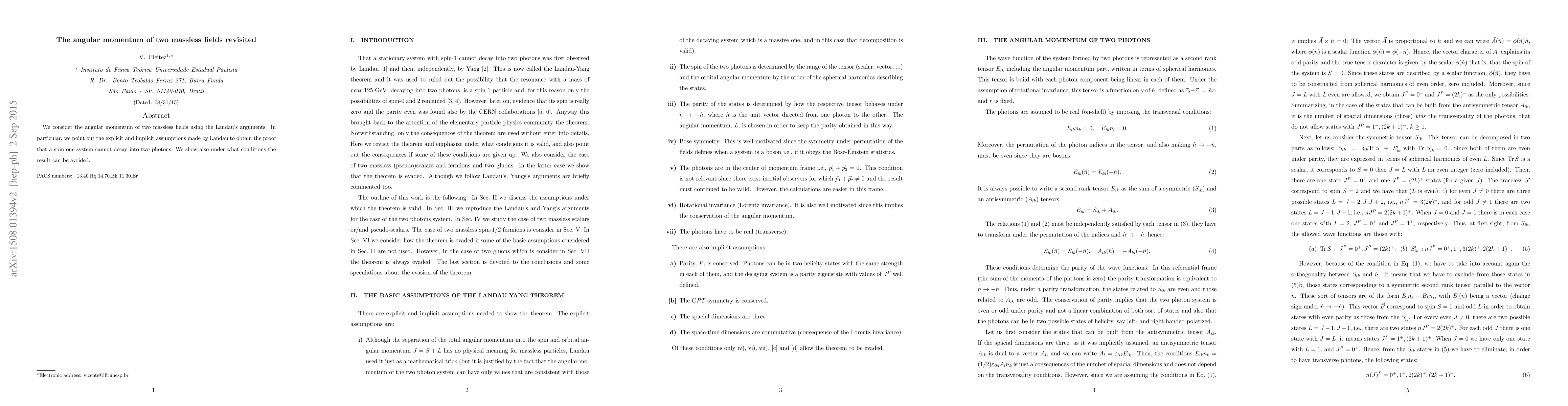 This paper revisits Landau's arguments on the angular momentum of two massless fields, specifically photons, and identifies the assumptions underlying his proof that a spin-one system cannot decay into two photons. It also explores scenarios where this result can be circumvented.