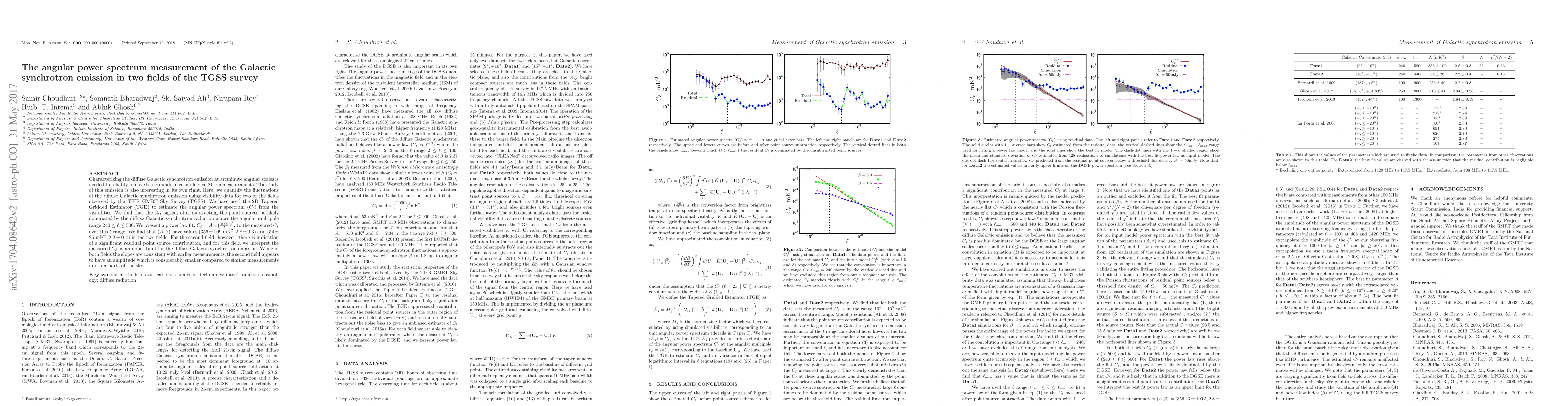 Researchers measured the angular power spectrum of Galactic synchrotron emission in two fields of the TGSS survey, finding a power law fit to the data with varying amplitudes and slopes between fields.