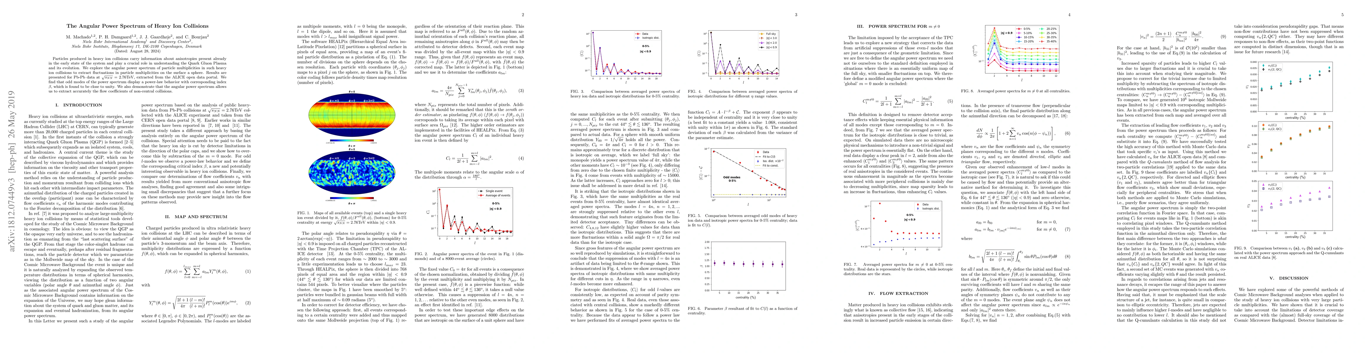 This paper investigates the angular power spectrum of particle multiplicities from Pb-Pb collisions at 2.76 TeV, revealing a power-law behavior in odd modes with an index close to unity, and demonstrating the spectrum's ability to accurately extract flow coefficients in non-central collisions.