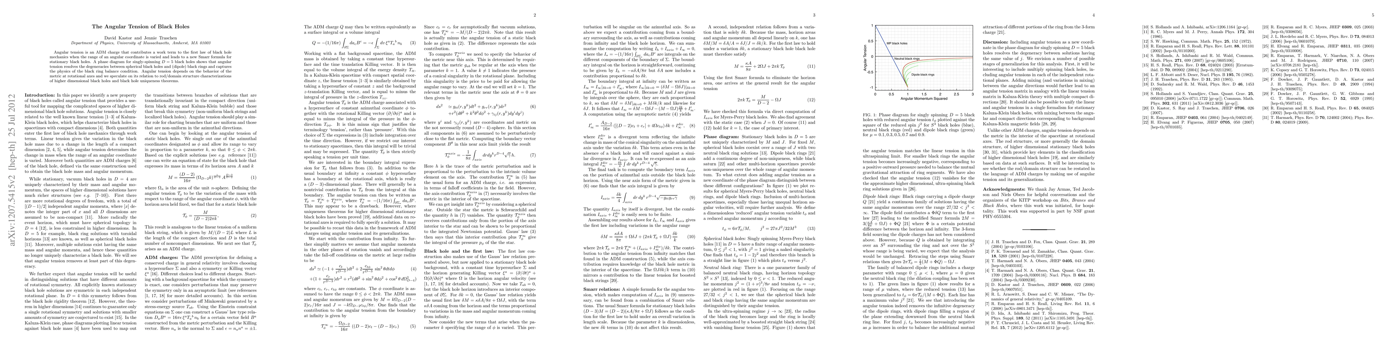 Angular tension is an ADM charge that contributes a work term to the first law of black hole mechanics when the range of an angular coordinate is varied and leads to a new Smarr formula for stationary black holes. A phase diagram for singly-spinning D=5 black holes shows that angular tension resolves the degeneracies between spherical black holes and (dipole) black rings and captures the physics of the black ring balance condition. Angular tension depends on the behavior of the metric at rotational axes and we speculate on its relation to rod/domain structure characterizations of higher dimensional black holes and black hole uniqueness theorems.