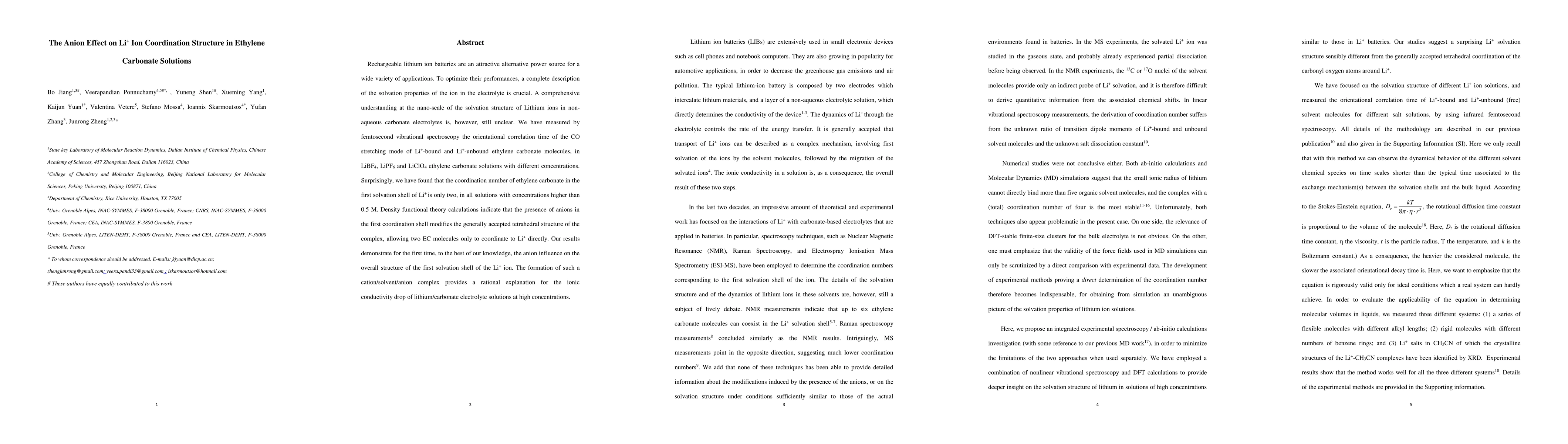 Rechargeable lithium ion batteries are an attractive alternative power source for a wide variety of applications. To optimize their performances, a complete description of the solvation properties of the ion in the electrolyte is crucial. A comprehensive understanding at the nanoscale of the solvation structure of lithium ions in nonaqueous carbonate electrolytes is, however, still unclear. We have measured by femtosecond vibrational spectroscopy the orientational correlation time of the CO stretching mode of Li+-bound and Li+-unbound ethylene carbonate molecules, in LiBF4, LiPF6, and LiClO4 ethylene carbonate solutions with different concentrations. Surprisingly, we have found that the coordination number of ethylene carbonate in the first solvation shell of Li+ is only two, in all solutions with concentrations higher than 0.5 M. Density functional theory calculations indicate that the presence of anions in the first coordination shell modifies the generally accepted tetrahedral structure of the complex, allowing only two EC molecules to coordinate to Li+ directly. Our results demonstrate for the first time, to the best of our knowledge, the anion influence on the overall structure of the first solvation shell of the Li+ ion. The formation of such a cation/solvent/anion complex provides a rational explanation for the ionic conductivity drop of lithium/carbonate electrolyte solutions at high concentrations.
