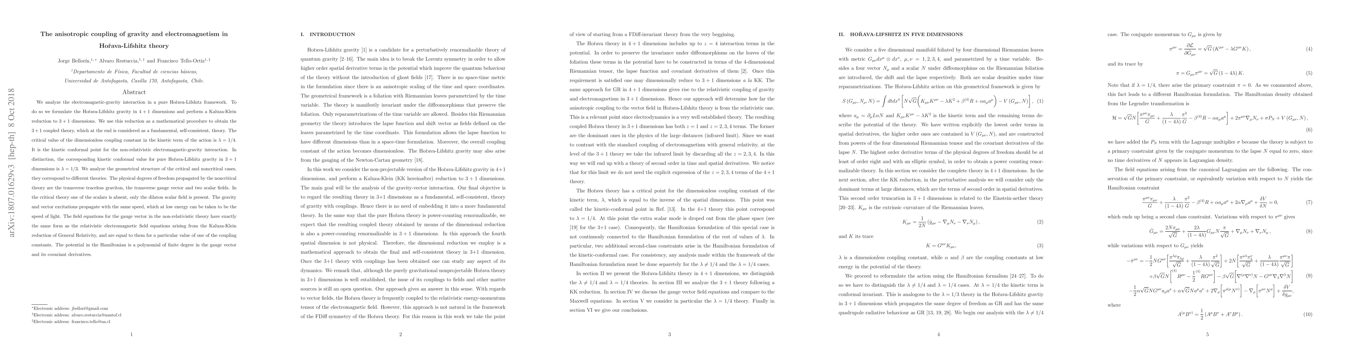 This paper investigates the interaction between gravity and electromagnetism in the Hořava-Lifshitz theory, formulated in $4+1$ dimensions and reduced to $3+1$ dimensions via Kaluza-Klein. The critical coupling constant $\lambda=1/4$ defines the kinetic conformal point for the non-relativistic electromagnetic-gravity interaction, distinguishing it from the $\lambda=1/3$ value for pure Hořava-Lifshitz gravity.
