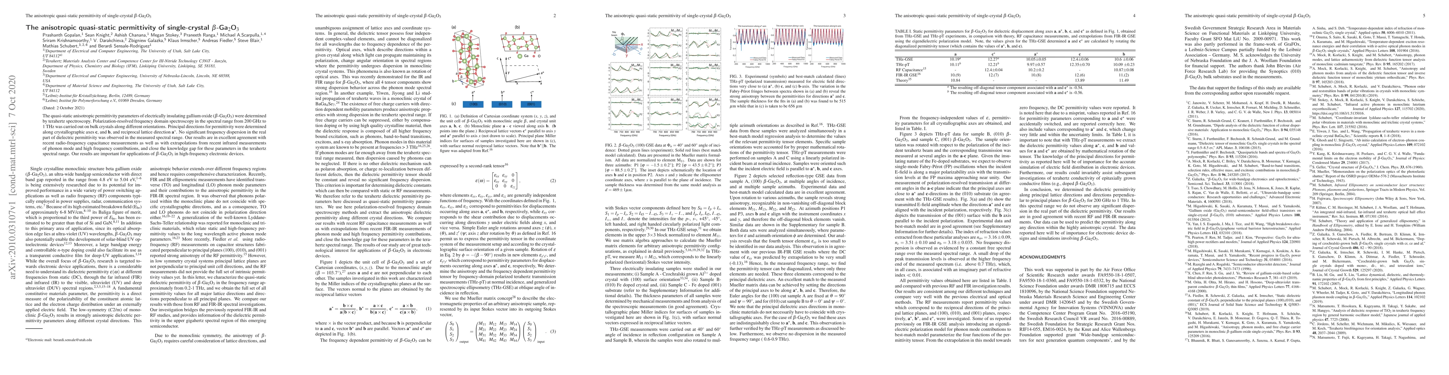 The quasi-static anisotropic permittivity parameters of electrically insulating gallium oxide (beta-Ga2O3) were determined by terahertz spectroscopy. Polarization-resolved frequency domain spectroscopy in the spectral range from 200 GHz to 1 THz was carried out on bulk crystals along different orientations. Principal directions for permittivity were determined along crystallographic axes c, and b, and reciprocal lattice direction a*. No significant frequency dispersion in the real part of dielectric permittivity was observed in the measured spectral range. Our results are in excellent agreement with recent radio-frequency capacitance measurements as well as with extrapolations from recent infrared measurements of phonon mode and high frequency contributions, and close the knowledge gap for these parameters in the terahertz spectral range. Our results are important for applications of beta-Ga2O3 in high-frequency electronic devices