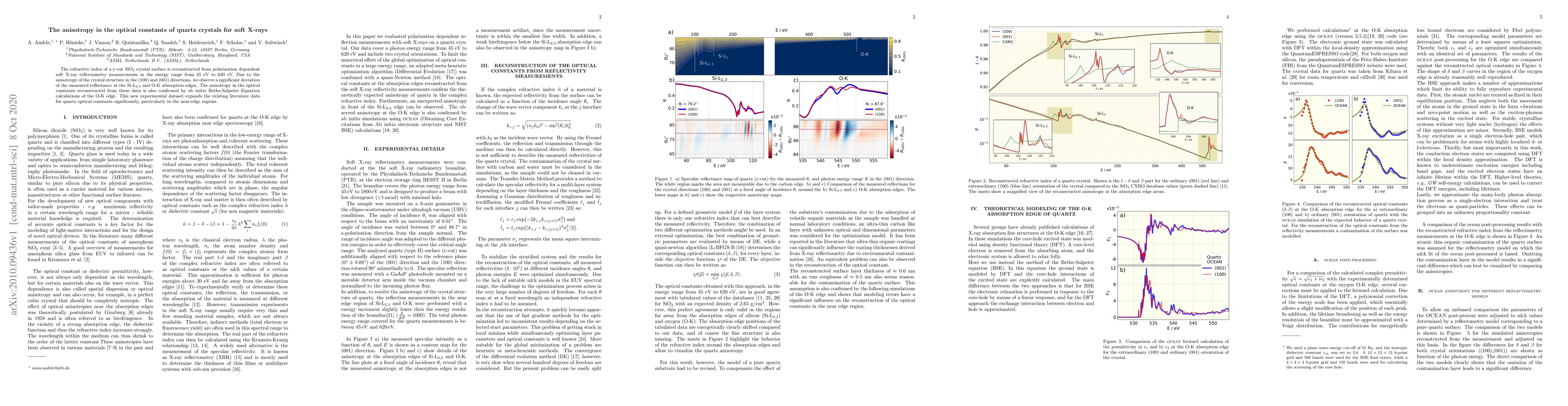 The refractive index of a y-cut SiO$_2$ crystal surface is reconstructed from polarization dependent soft X-ray reflectometry measurements in the energy range from 45 eV to 620 eV. Due to the anisotropy of the crystal structure in the (100) and (001) directions, we observe a significant deviation of the measured reflectance at the Si-L$_{2,3}$ and O-K absorption edges. The anisotropy in the optical constants reconstructed from these data is also confirmed by ab initio Bethe-Salpeter Equation calculations of the O-K edge. This new experimental dataset expands the existing literature data for quartz optical constants significantly, particularly in the near-edge regions.